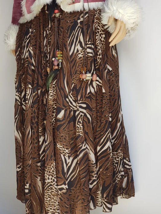 1990s Sexy Bohemian Rockstar Vintage Maxi Skirt / Dress - Floaty Multi Tier Cut - Insane Tiger & Cheetah Print - Multi Layered - Tribal Beading Drawstring Waist
