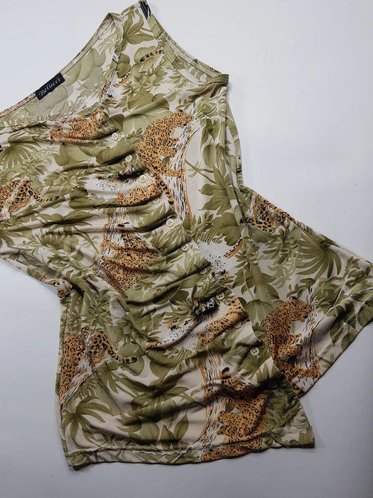 1990s Sexy Vintage Italian Asymmetrical Print Top - Leopard in the Jungle Print - Button Feature Front - Tight & Form Fitting Stretch Fabric - Muted Greens & Neutrals