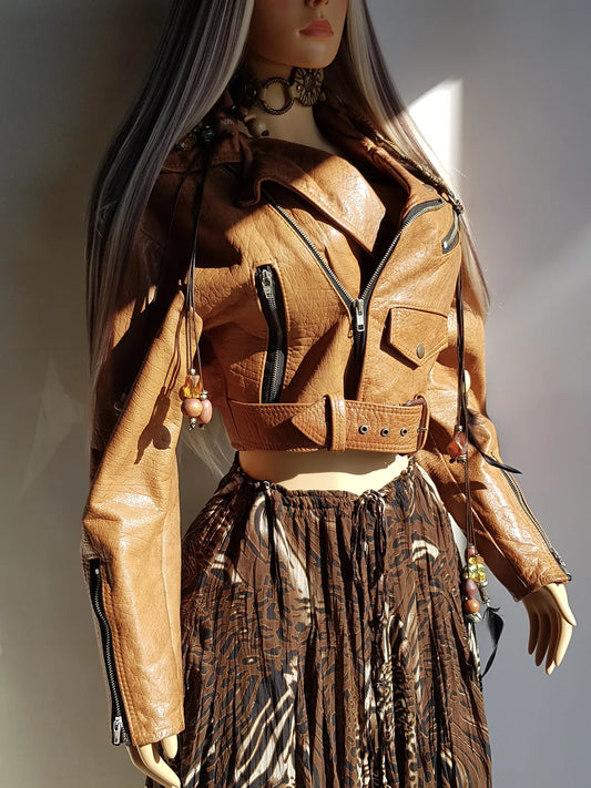 90s Vintage Italian 100% Genuine Leather Jacket - Snakeskin print Rich Cognac Brown - zip front Motorcycle style with metal pop button collar