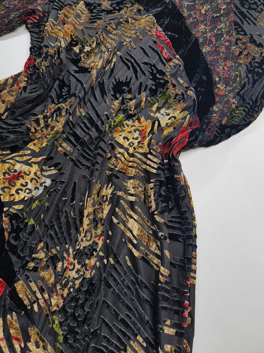 1990s Sexy Vintage Designer Bohemian Rockstar Style Burnout Flocked Velvet - Tiger Print with Red Accents - Asymmetrical Hemline Top with Knit Sleeves