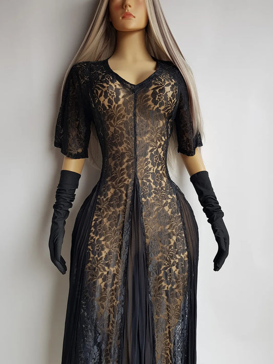 Gothic Romance Genuine 1990s Vintage Sheer Lace Dress with Flared Skirt - Wear Multiple Ways on top of Lingerie or a Slip