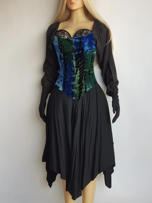 Authentic 1990s Whimsigoth Peasant Dress in Plush Velvet - Greens & Blues - Hand Dyed - medieval metal buttons - long sleeve & handkerchief hemline