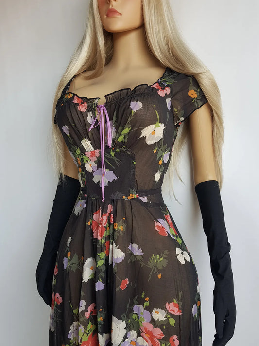 Vintage Genuine 1970s Italian Sheer Floral dress with Milkmaid Bust & Tailored Waist - Sophia Loren European Summer