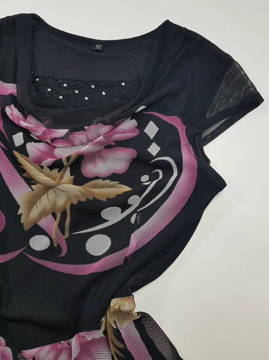 1990s Sexy Vintage Whimsical Dark Garden Fairy Dress - Mesh Cowl Neck - Tailored Beautifully- Handkerchief Hemline - Lace & Rhinestone Bust - Insane Floral Print