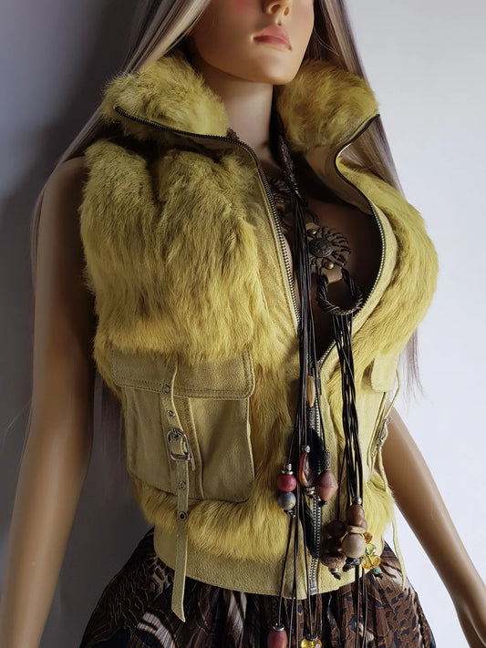 1990s Italian Vintage Light Chartreuse Fur & Suede Vest - fully lined - metal zip - suede feature pockets with tassel buckles