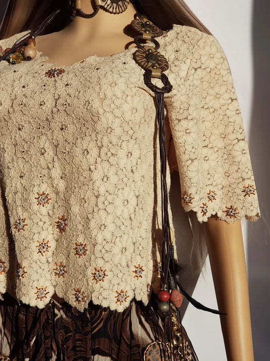 Incredible Delicate Vintage 1950s Custard Toned - Raw Edged - Scalloped Lace Hand Beaded top