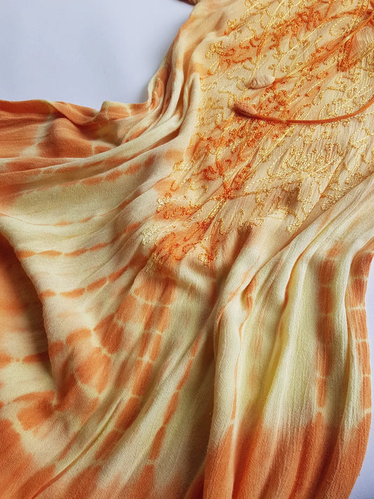 Unbelievable 90s Sunset Yellow & Orange Bohemian Goddess Sundress - Embroidered Silky Soft Cotton - Bohemian Goddess - Hand Dyed - Asymmetrical Hemline & Flattering Hourglass Shape