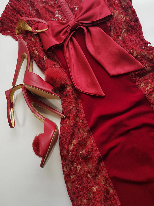 1990s Romantic Ruby Red Designer Vintage Lace & Velvet Dress - Knockout for Evening & The Perfect Dinner Date - Unbelievably Gorgeous