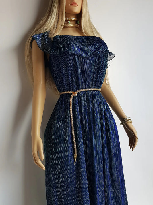 Authentic 1970s Grecian Sheer Gown in Metallic Blue - Flouncy Ruffles & Drapery - Very Halston & Studio54 style - Can be worn multiple ways off shoulder & asymmetrical
