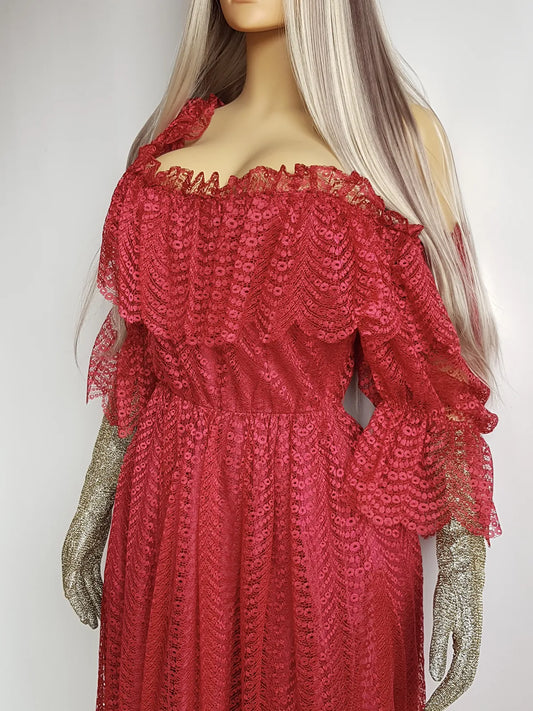 Authentic 1970s Romantic Flowy Flouncy off-shoulder Peasant Style Gown in Beautiful Rose Red - Draping & Gathering Effect All Over