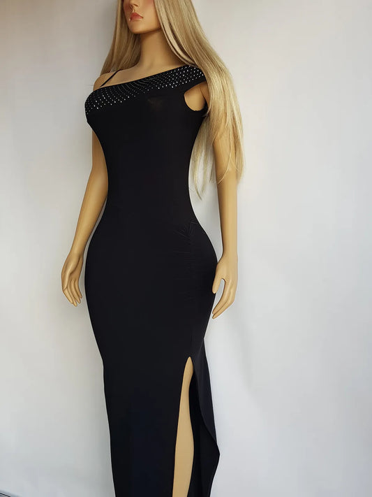 Iconic 90s Super Sexy Crystal Encrusted One Shoulder Gown - Absolutely Beautiful Silhouette & Hip Ruching - Black with Diamonds - Stretch body hugging high quality fabric