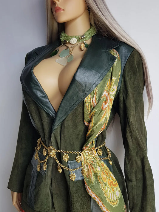 1970s Authentic Vintage Bohemian Tie Choker / Necklace / Belt - Handmade & Only 1 ever made - 100% Genuine Leather with Feathers & Stones - Metal & Wooden Carved Beads - Ultra Heavy - Gorgeous Greens Ambers and Browns