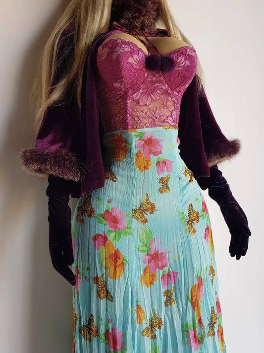Knockout 90s Vintage Butterfly Skirt in magnetic blue with pink & Orange butterfly print - crinkle fabric look - absolutely gorgeous worn low on the hips