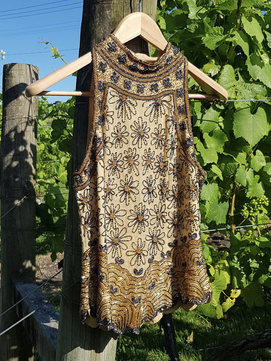 1990s Vintage 100% Silk Fully Hand Beaded Evening Top - Gold & Brown Tones