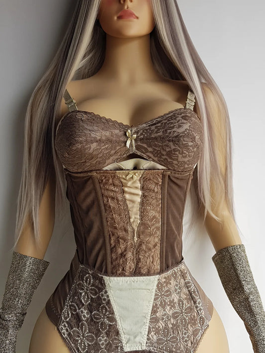 Vintage Authentic 1990s Pistachio Swirl Collection - Custom Hand Dyed Corset with Lace Overlay - Chocolate Brown - Only One Made