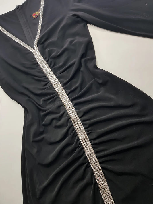 Iconic 90s Super Sexy Crystal Gown Absolutely Beautiful Silhouette & Ruching all up the front - Chunky Heavy Crystals up the entire front split of the dress right up to the shoulders - Stretch body hugging high quality fabric