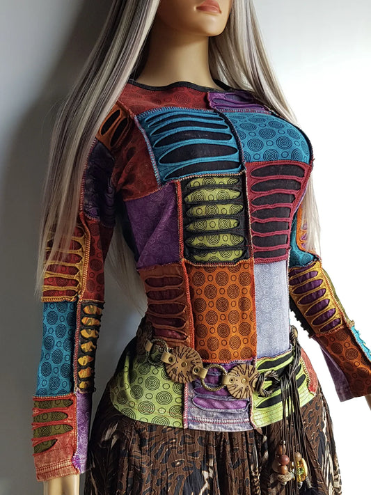 Authentic 90s Rare Whimsigoth / Fairy - Unbelievable Handmade Hand Dyed & Bleach Effect Patchwork Top - Insane Hand ripping techniques all over the patches - Contrast Seams - Unworn Vintage Condition