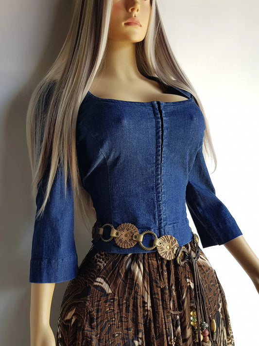 Italian 1990s Vintage Denim Corset Top - Low Bust - Hook Closure - Unbelievably Sexy - 3/4 Sleeve