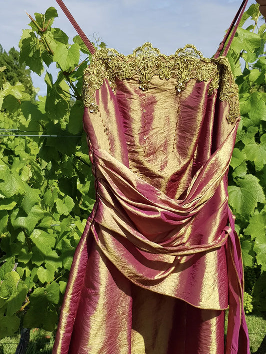 2000s Whimsical Iridescent Fairy Dress in Colour Changing Rose Gold - Hand Beaded - Multi Tier Dress - Applique Lace in Gold - Shirred Detailing