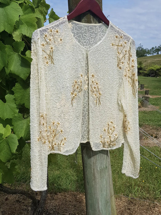 Vintage Ethereal 100% Silk - Bridal Quality Cream & Gold Flowers - Handmade Fully Beaded Jacket