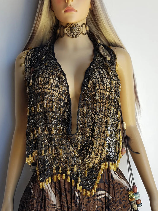Insane 1970s Handmade Crochet Beaded Party Top / Skirt / Wrap - Tie at neck - Studio 54 - Black Crochet & Gold Beading