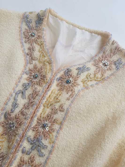 1950s Vintage Heavily Beaded Knit Jacket / Cardigan - Bridal Quality Cream Knit - Handmade Fully Lined Beaded Jacket
