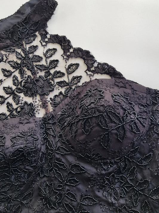 1990s Romantic Gothic Vintage High Neck Corset Top Lace & Hand Beaded - Knockout for Evening - Black Lace & Beads