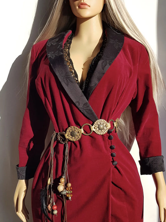 Vintage Romantic Goth 90s Tuxedo Coat in Rich Oxblood Red Velvet - Full Length - Gorgeous Tailoring - Beautiful Side Buttons on the Waist