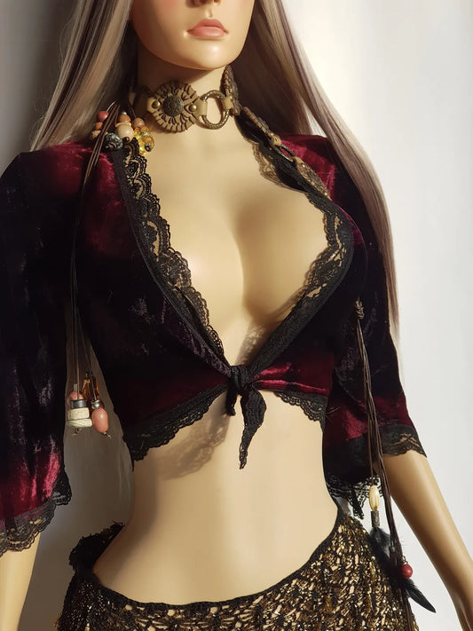 Vintage Rich Plum Velvet & Lace Fairy Top with Ornate Lace Edging - Sexy Sleeves & Tie Front - Hand Dyed