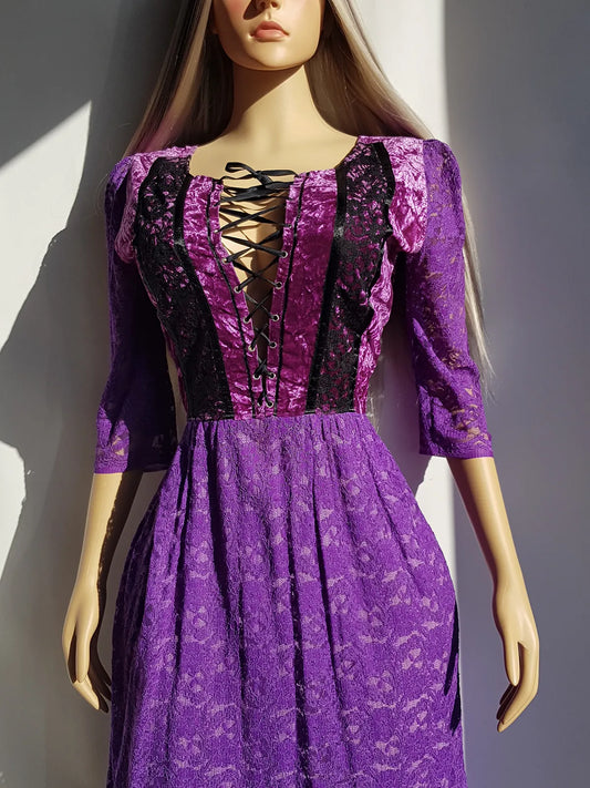Ultra Rare 1970s Corset Style Whimsigoth Fairy Dress in Purple Burnout Lace - Handmade & Hand Dyed - Gradient Purples Light to Dark - Double Layer Lace Hemline