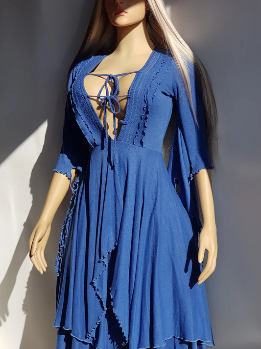 1970s Vintage Extremenly Rare Handkerchief Denim Blue Dress - Multi Layered - Corset Style Tie up Lace Front - Hourglass Waist - Knee Length Fairy Hemline - Asymmetrical Sleeves