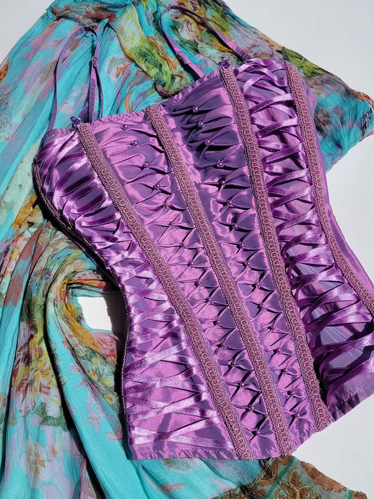 Vintage Hand Beaded 1990s Medieval Fairy Iridescent Purple Corset Top - Tailored Beautifully & Boned - Rich Purple Taffeta - Ribbons Ornate Borders Faceted Bead Clusters