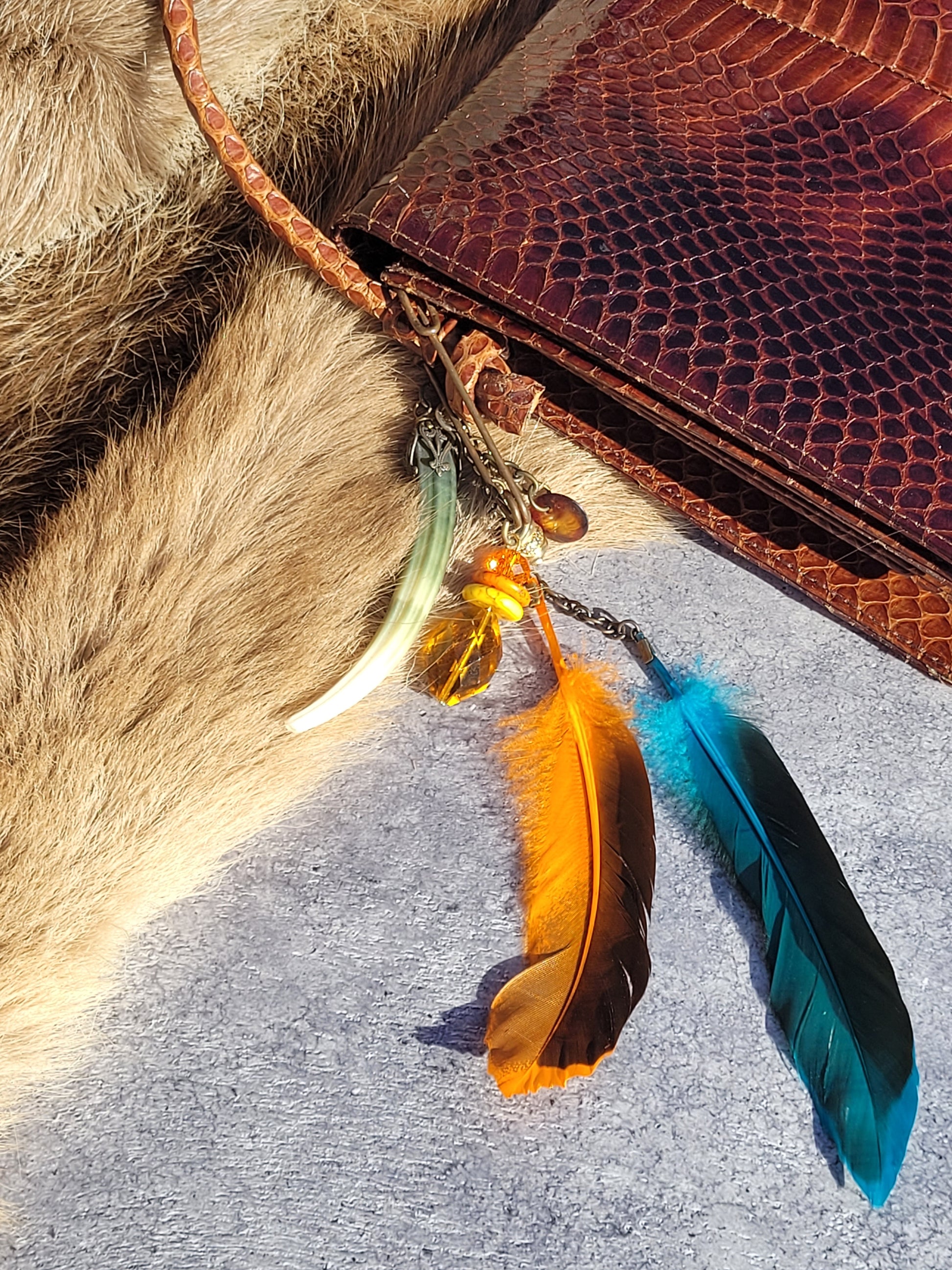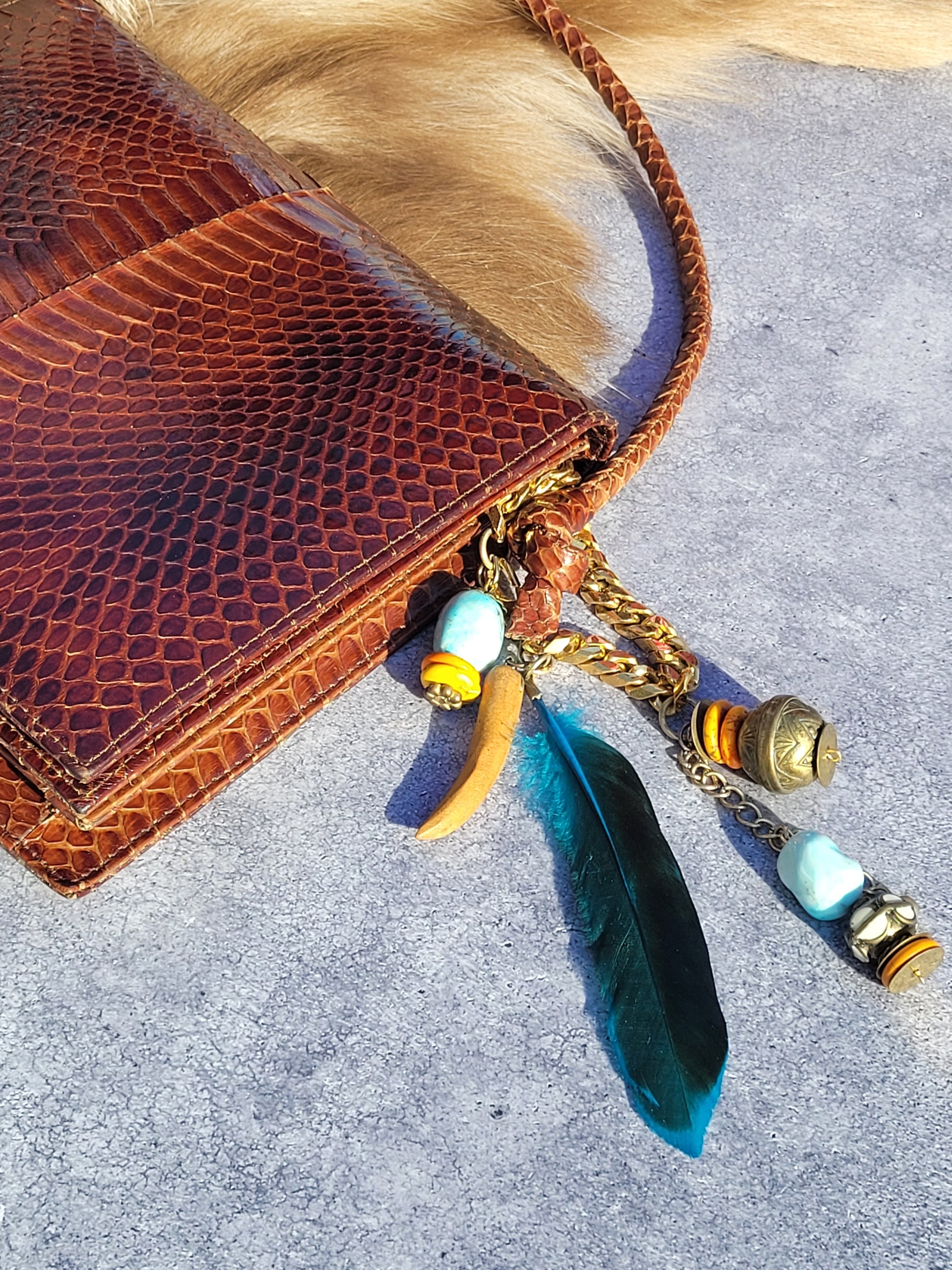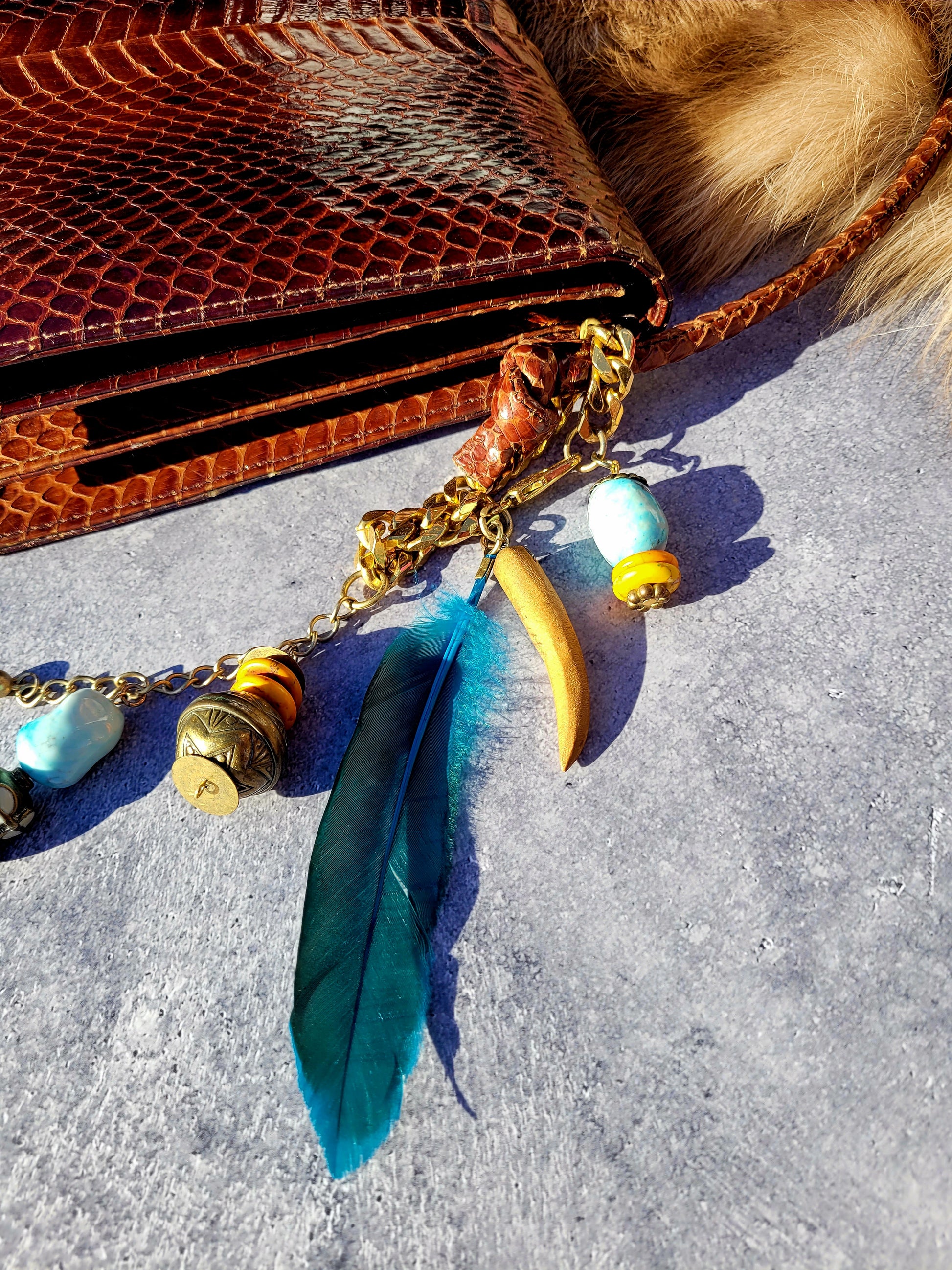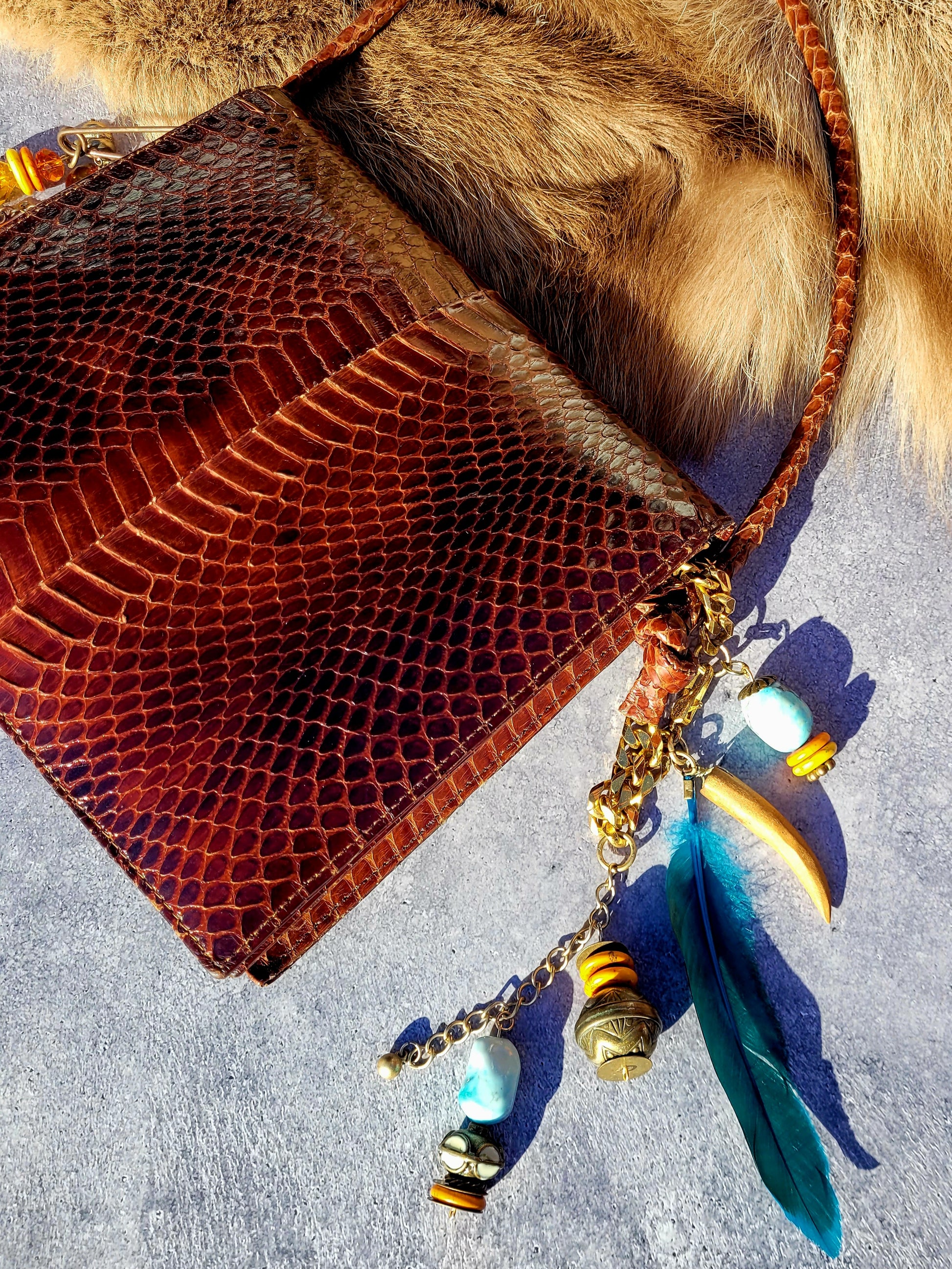 1920s Authentic Antique Snakeskin Bag - Rich Copper Brown - Antique Stacked Charms on Mixed Antique Chains - Carved Tusks / Feathers / Stones / Beading