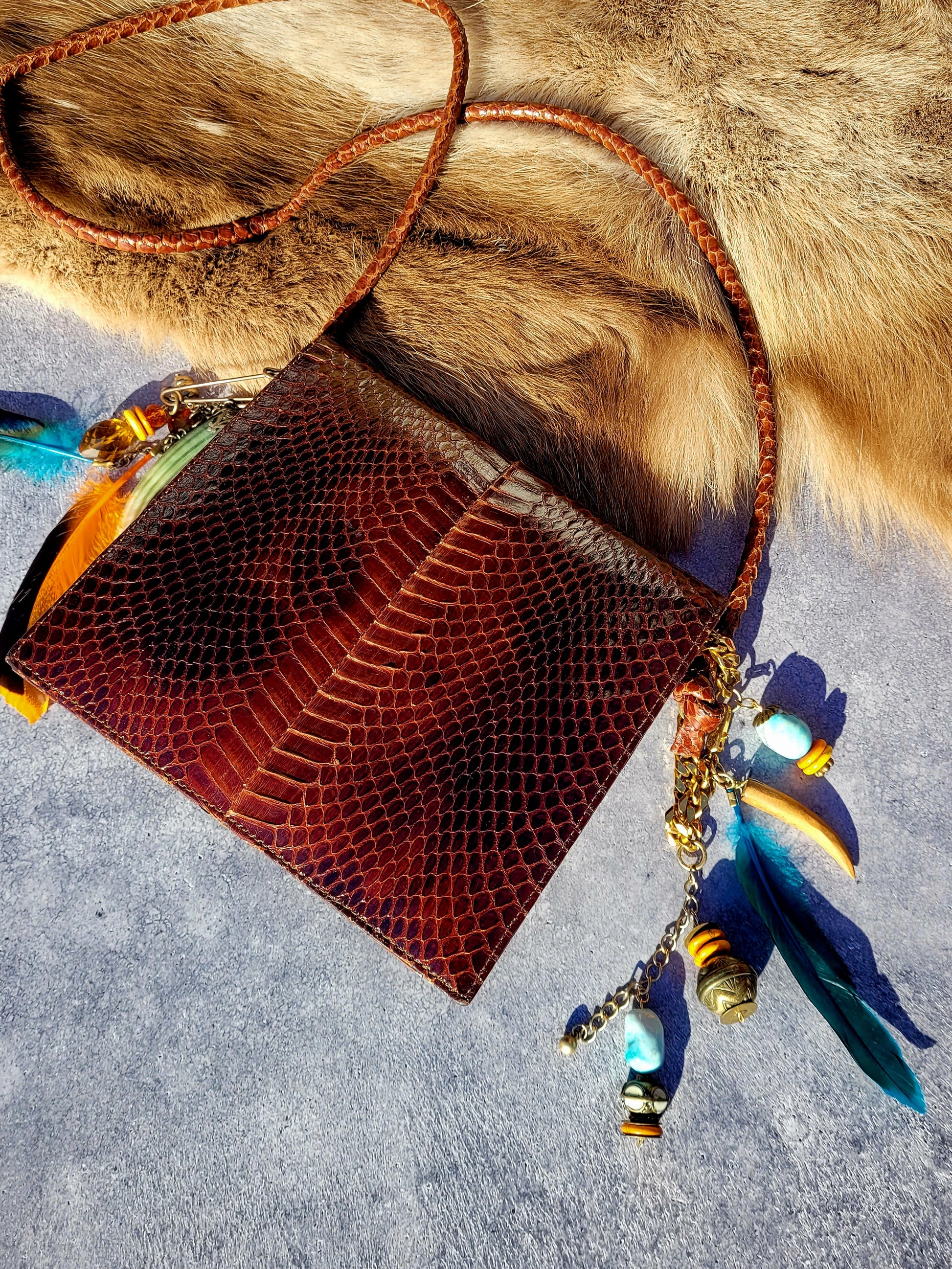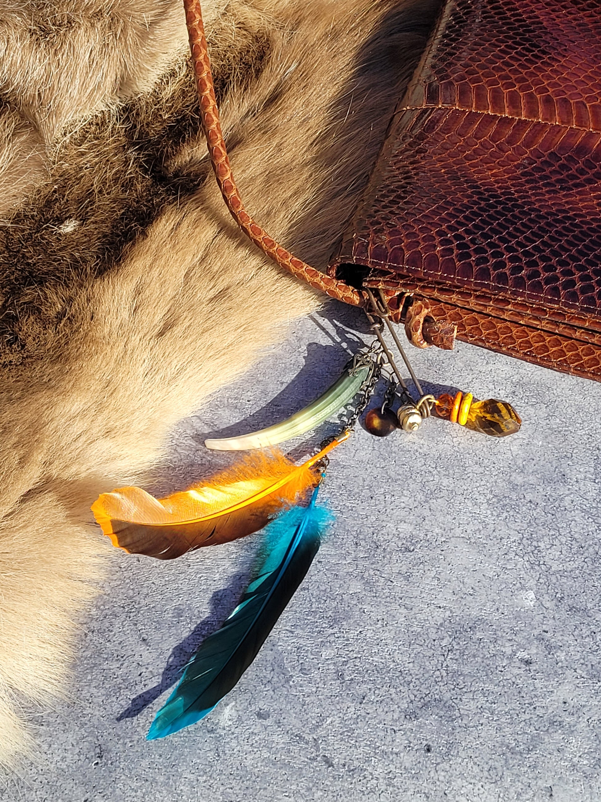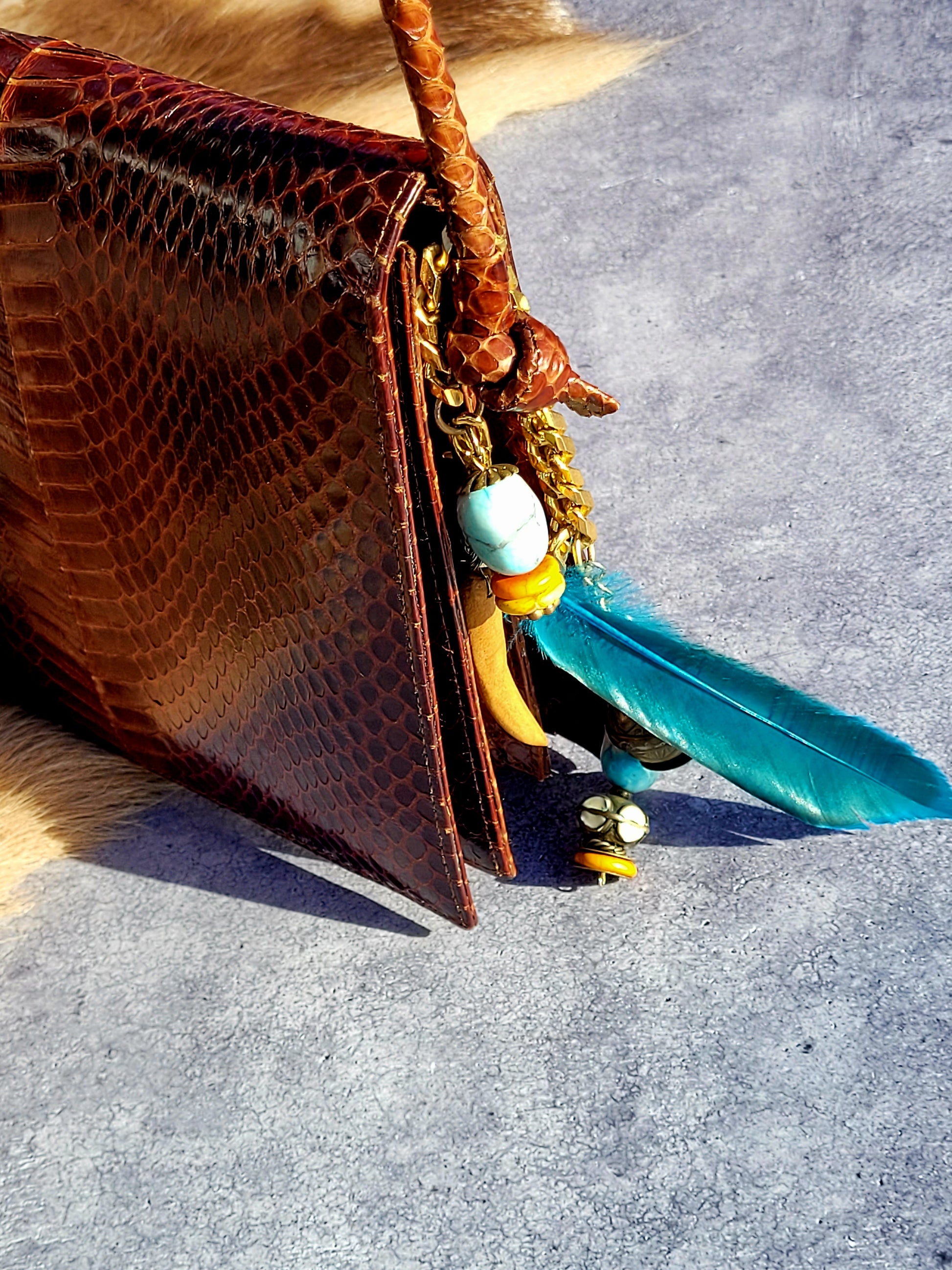 1920s Authentic Antique Snakeskin Bag - Rich Copper Brown - Antique Stacked Charms on Mixed Antique Chains - Carved Tusks / Feathers / Stones / Beading