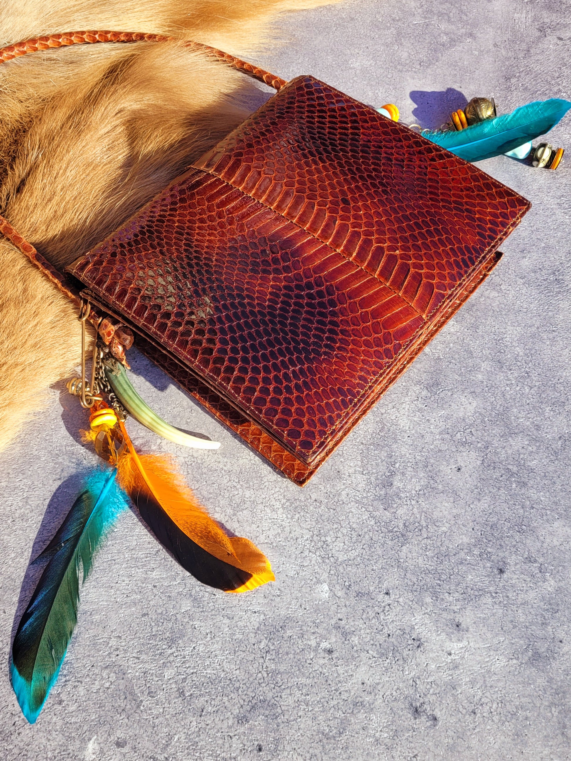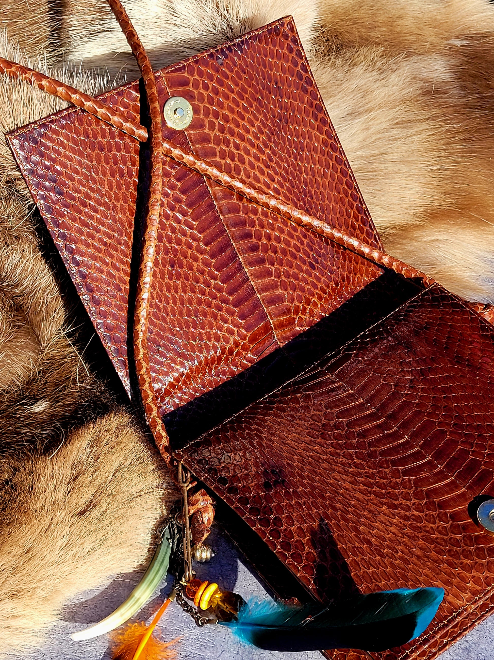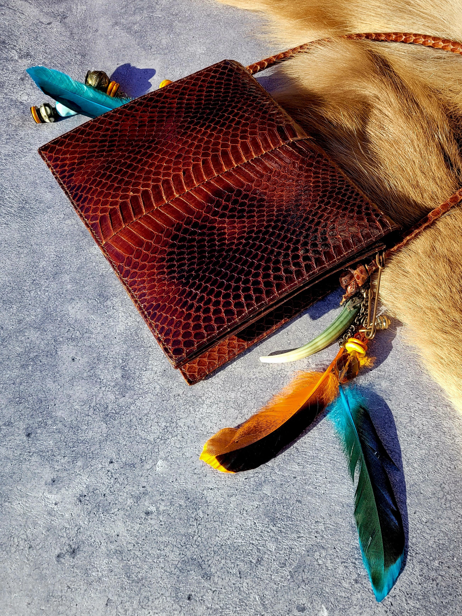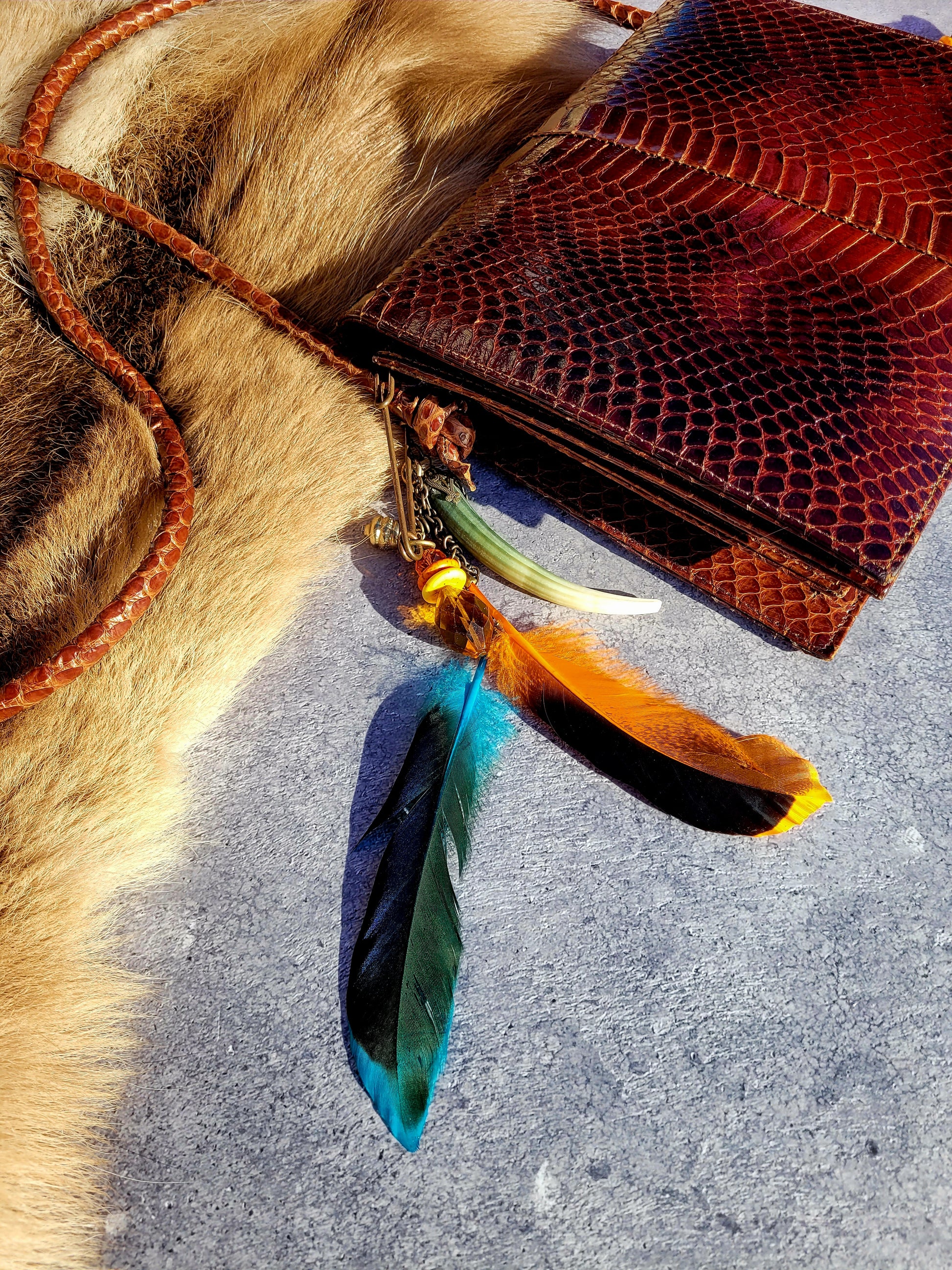 1920s Authentic Antique Snakeskin Bag - Rich Copper Brown - Antique Stacked Charms on Mixed Antique Chains - Carved Tusks / Feathers / Stones / Beading