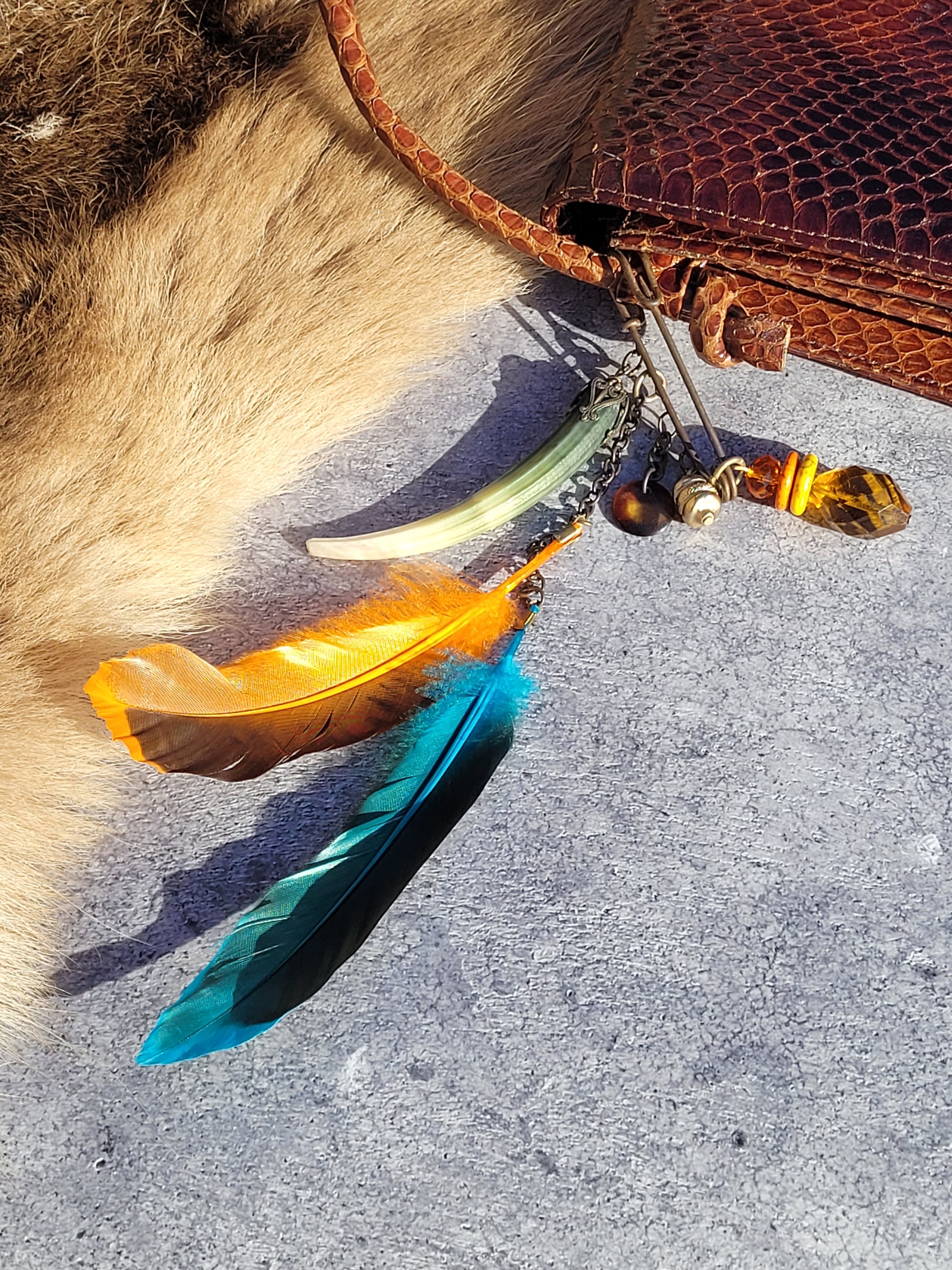 The Charms are on mixed metals Antique Chains and are loaded up with Carved Antique Tusks in wood and stone, dyed Feathers in rich oranges and blues, with Stacked Turquoise Stones and Beading.