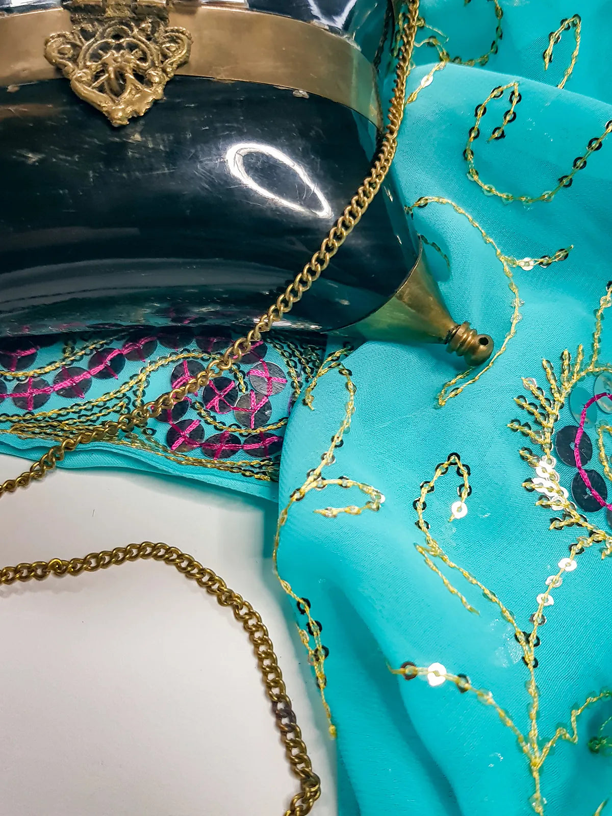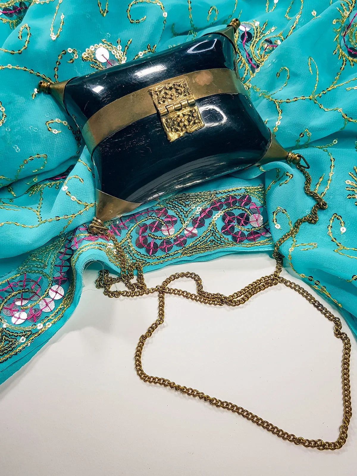 1930's Minaudière Velvet-Lined Horn & Brass Pillow Box Purse. Horn & Brass purse in the shape of pillow. This stunning black Art Deco designed purse also has a stunning black velvet lining. The filigree clasp in the front and hinge in the back are placed on the brass band that runs around the center of the purse. This Minaudière will definitely make a great conversation piece. Such a Treasure, this piece is lined in vibrant blue velvet. There are even tiny openings in the corner points for you to attach tassels! The hinge and clasp works just fine and is in great vintage shape. The chain is 40" and folds in half, for a second optional way to carry it.