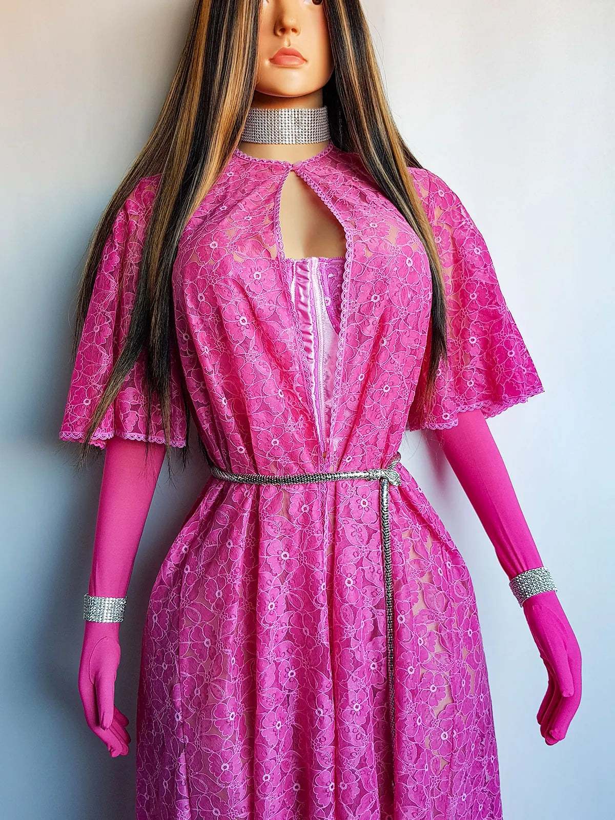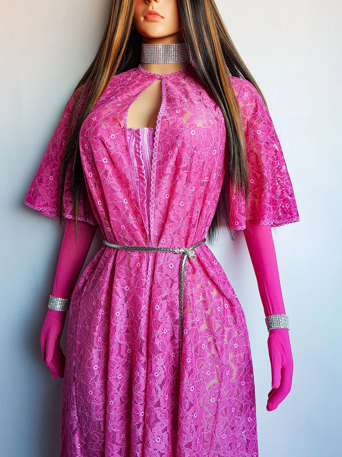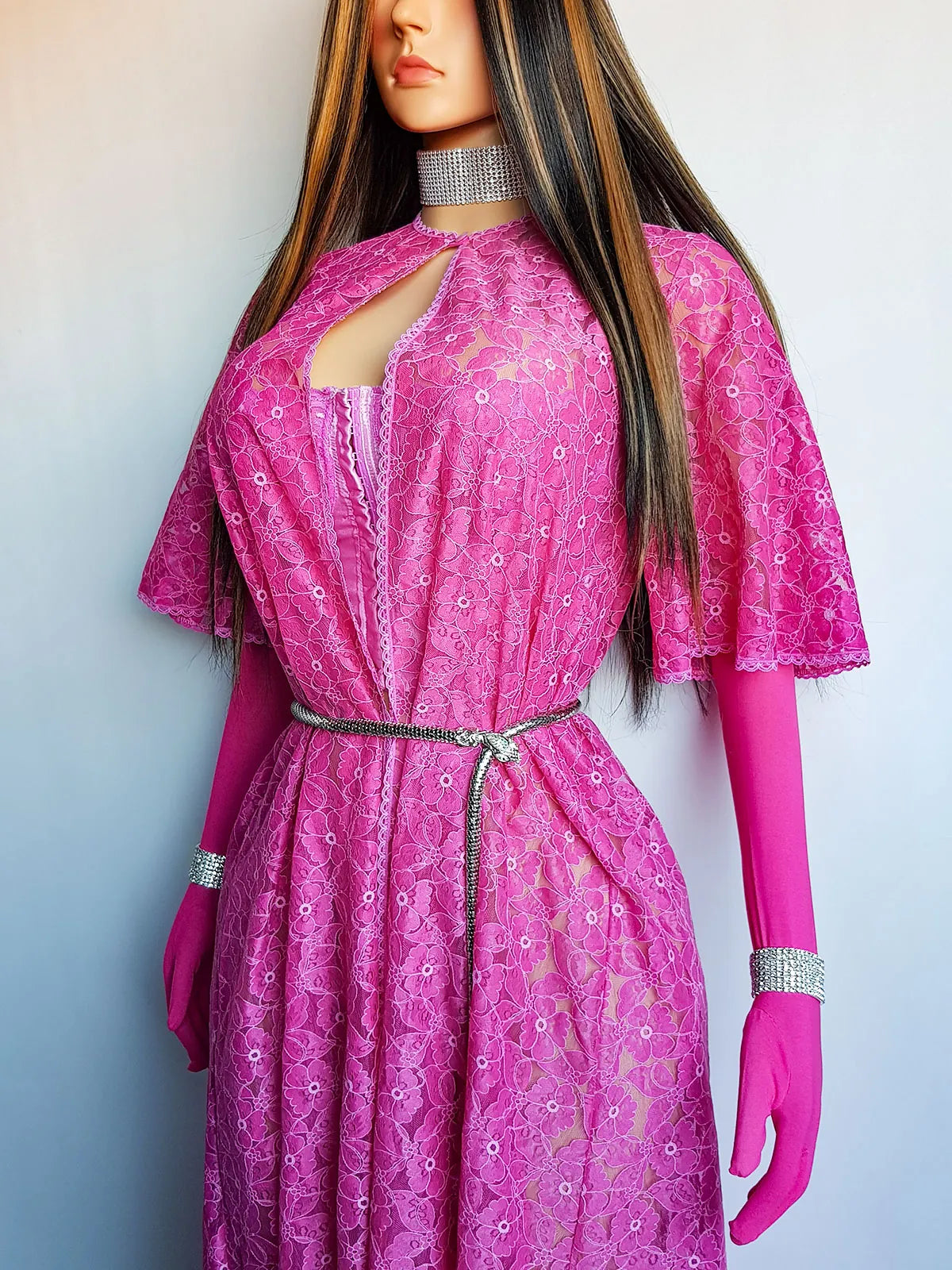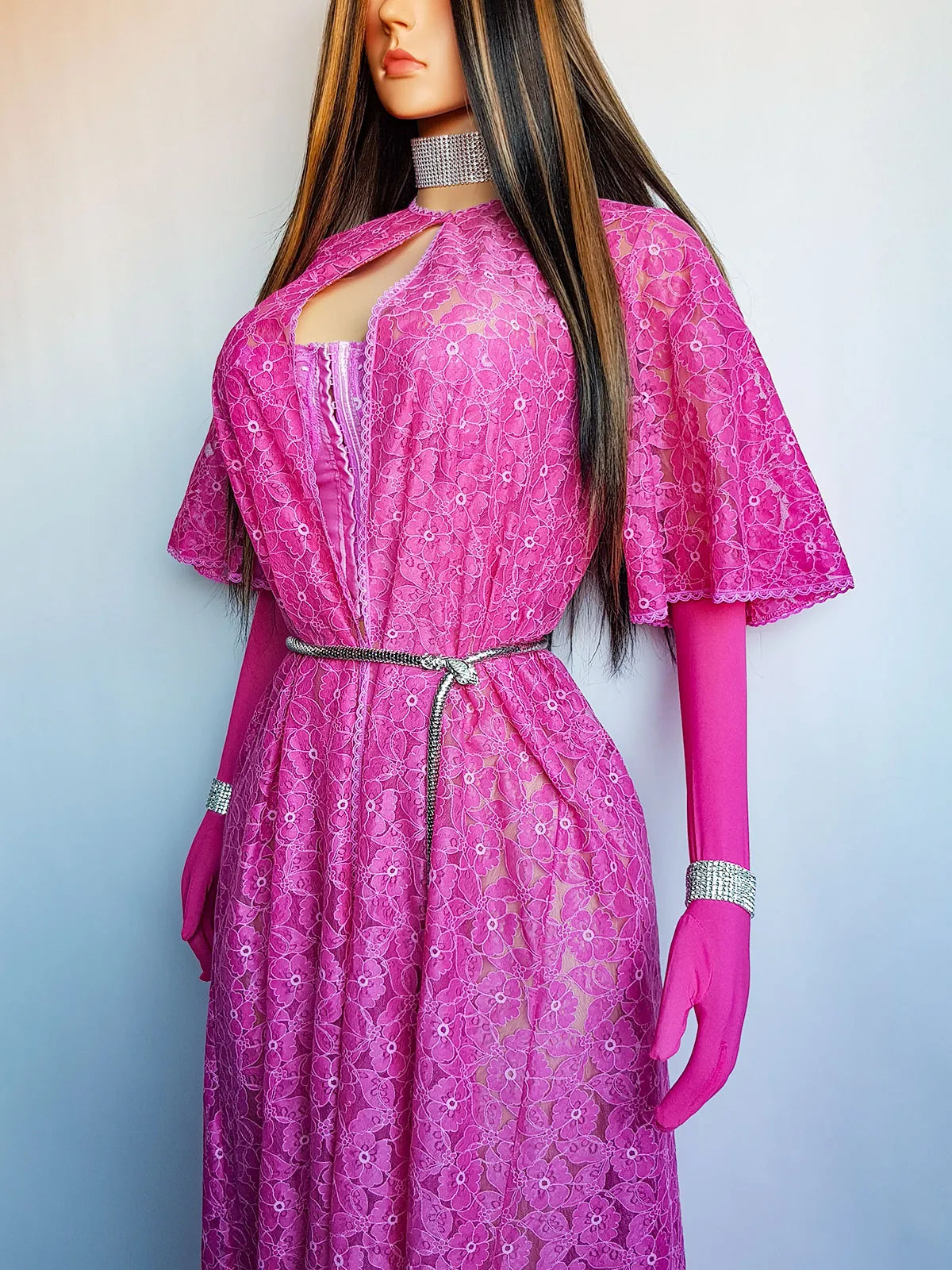 1950s Authentic Vintage Dramatic Floor Length Lace Coat - Ultimate Burlesque Piece - Hand Dyed in Perfect Shocking Pink - Button Collar and Open Front - Floral Print Lace - Immaculate
