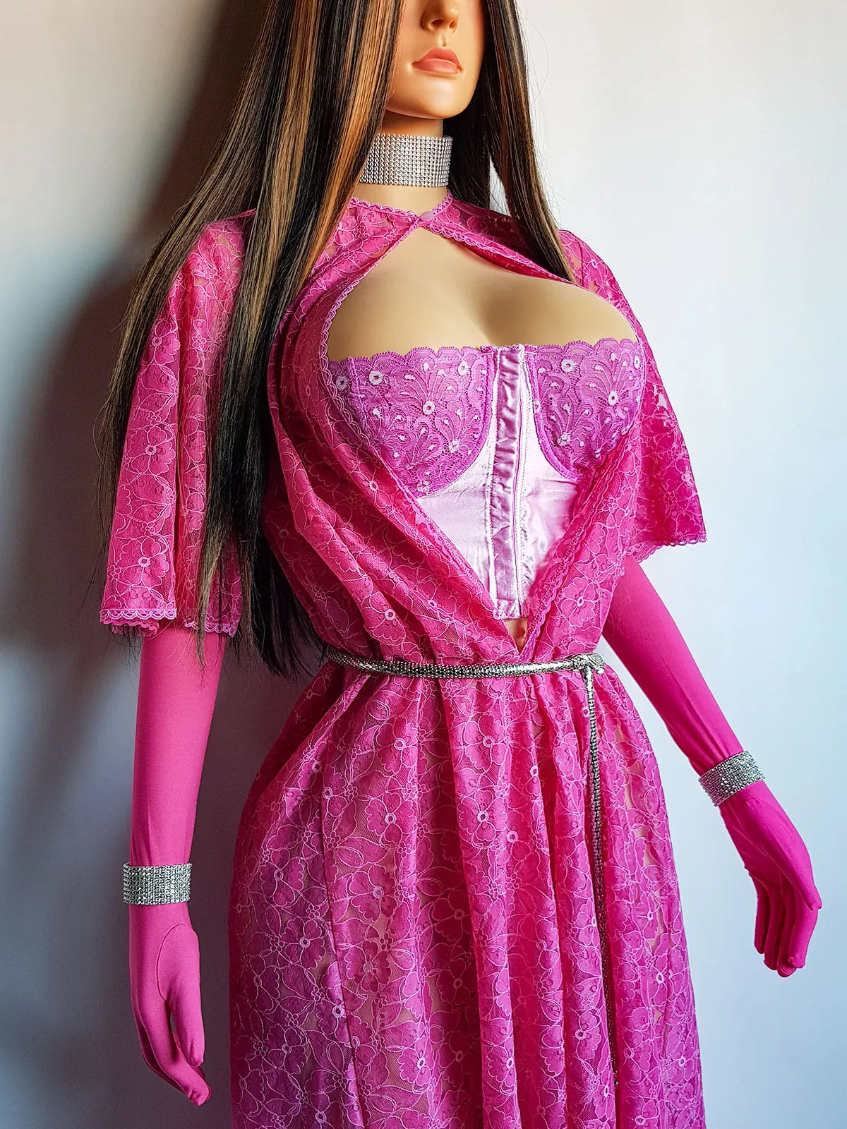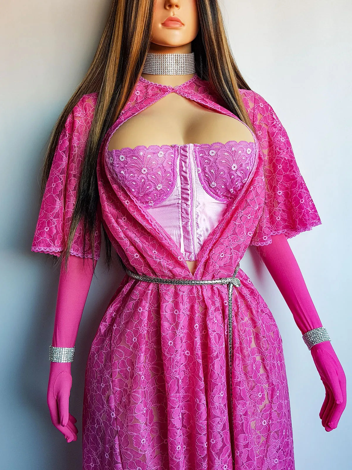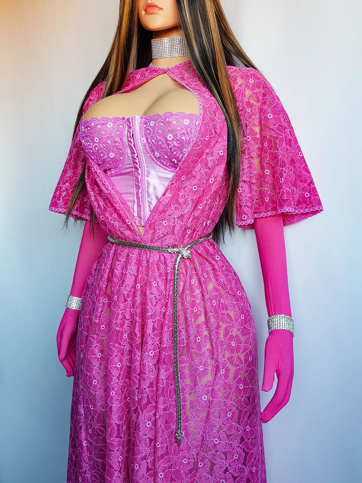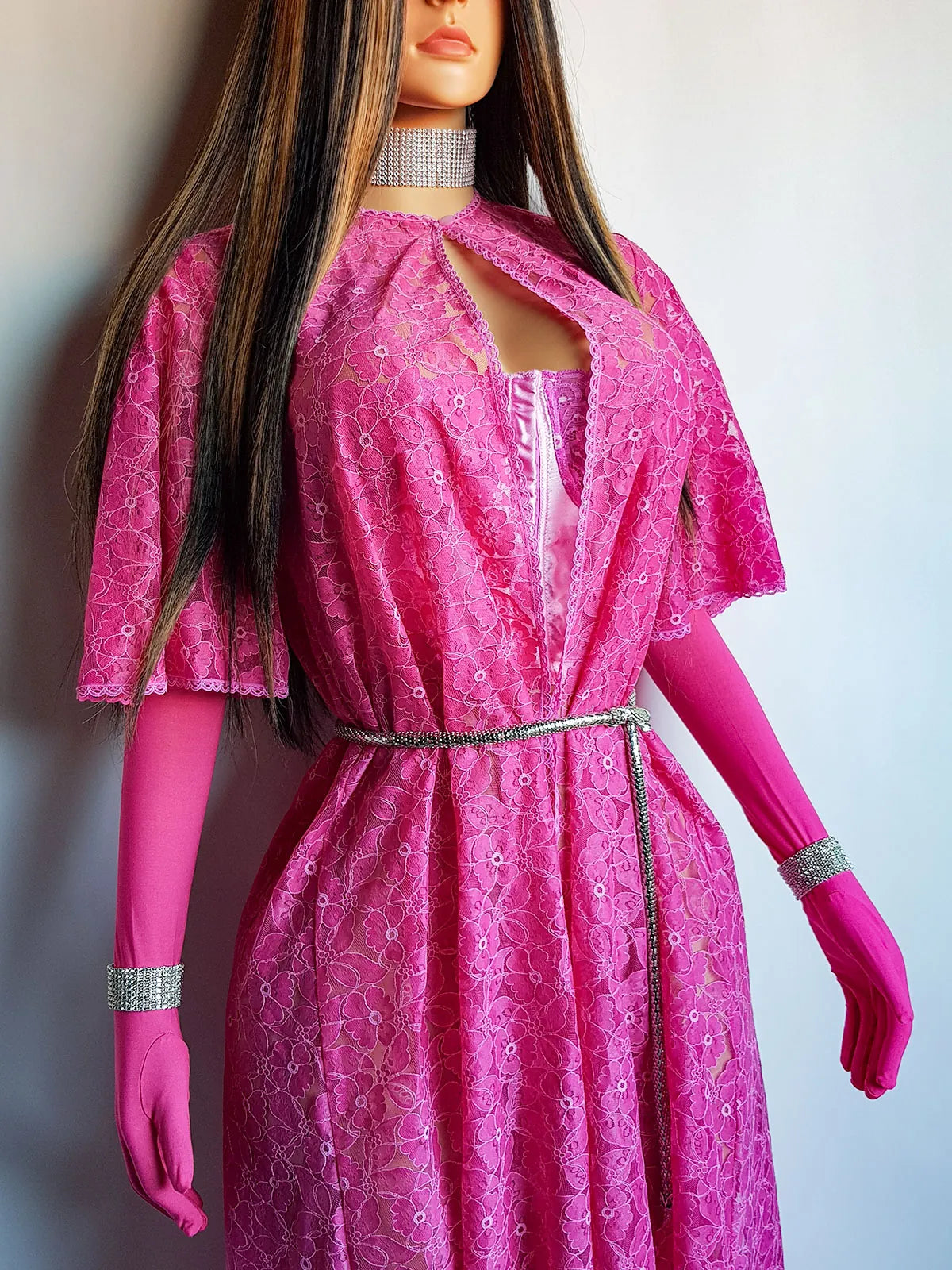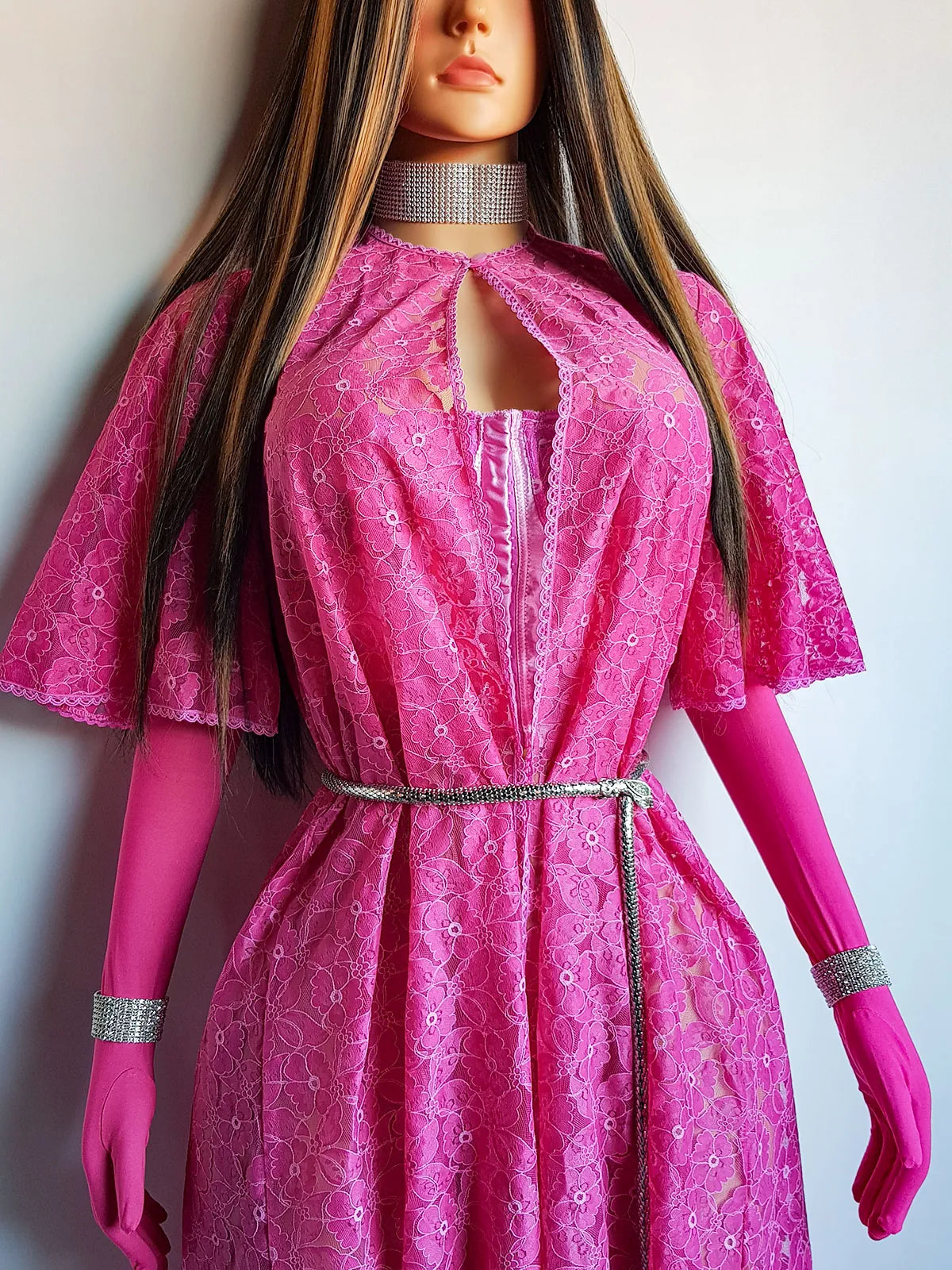 1950s Authentic Vintage Dramatic Floor Length Lace Coat - Ultimate Burlesque Piece - Hand Dyed in Perfect Shocking Pink - Button Collar and Open Front - Floral Print Lace - Immaculate