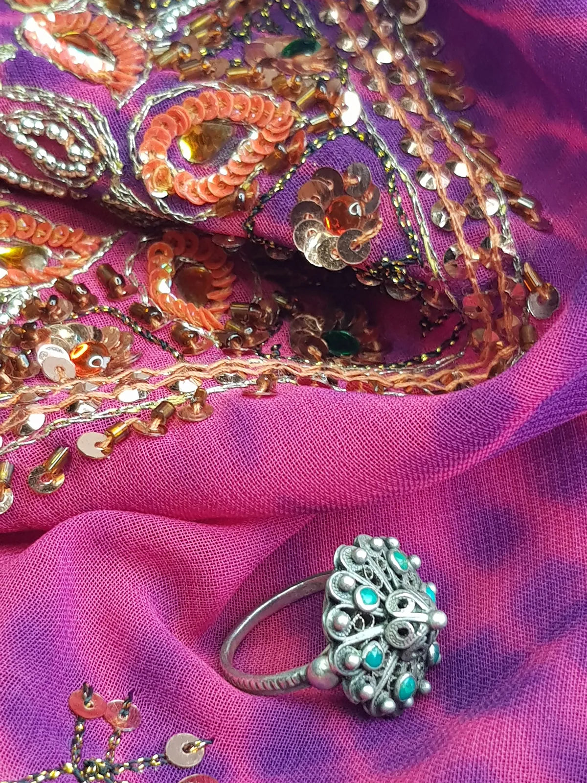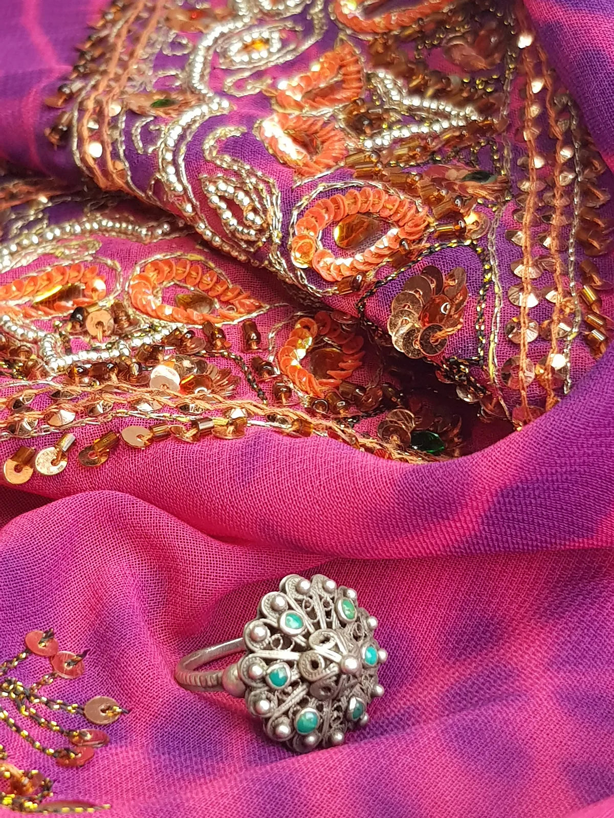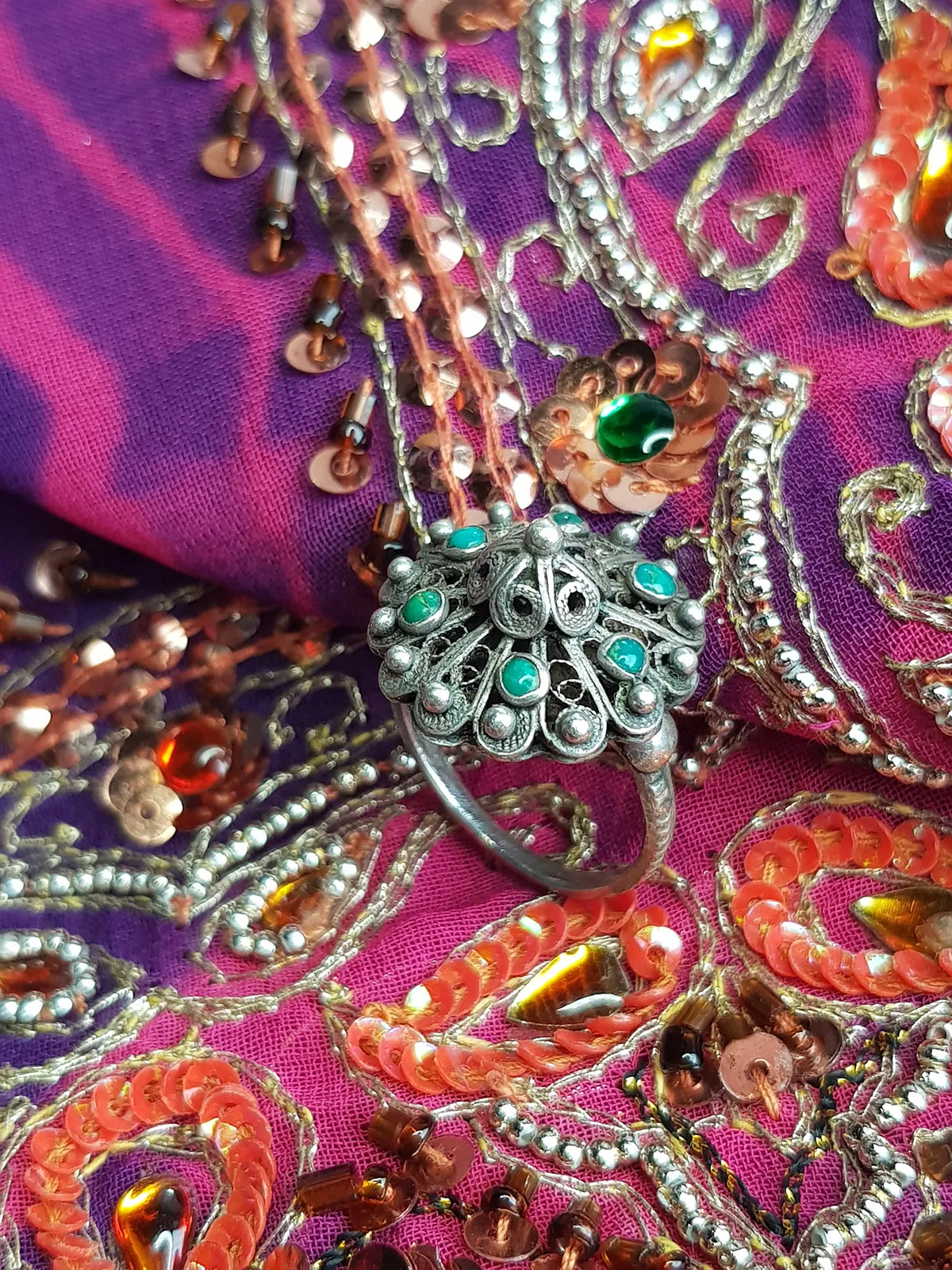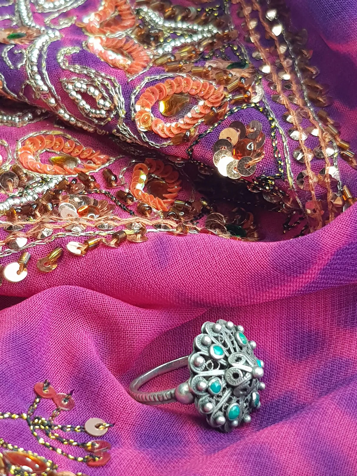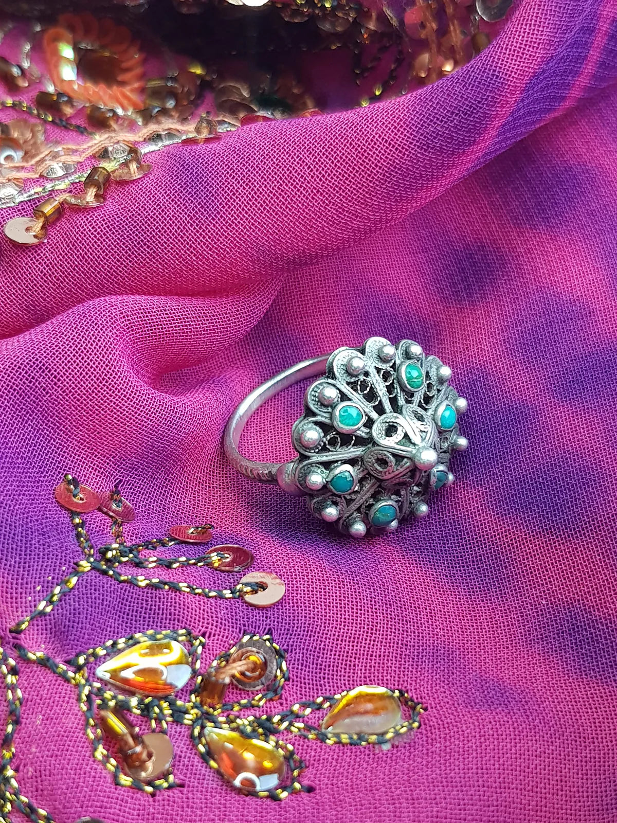 1950s Ornate Turquoise & Silver Ring with Intricate Wire Work