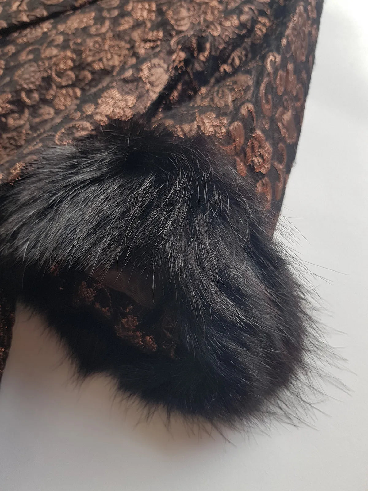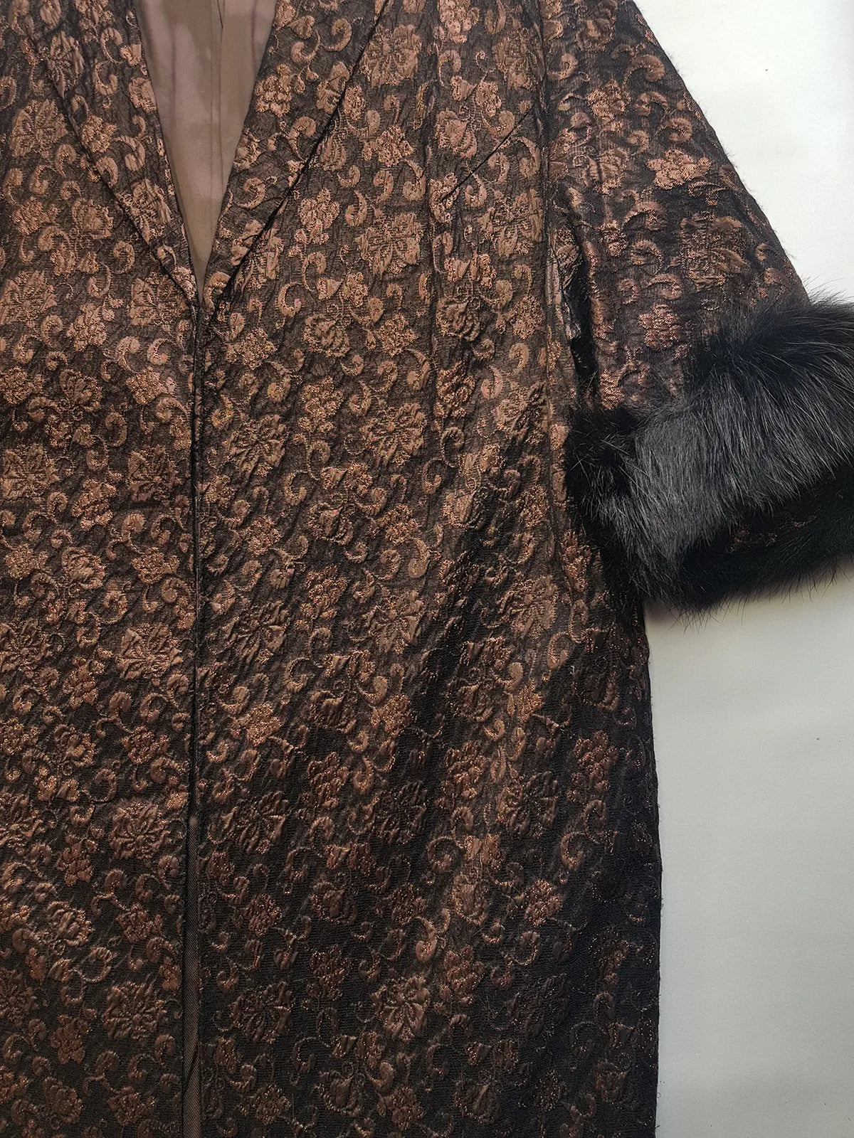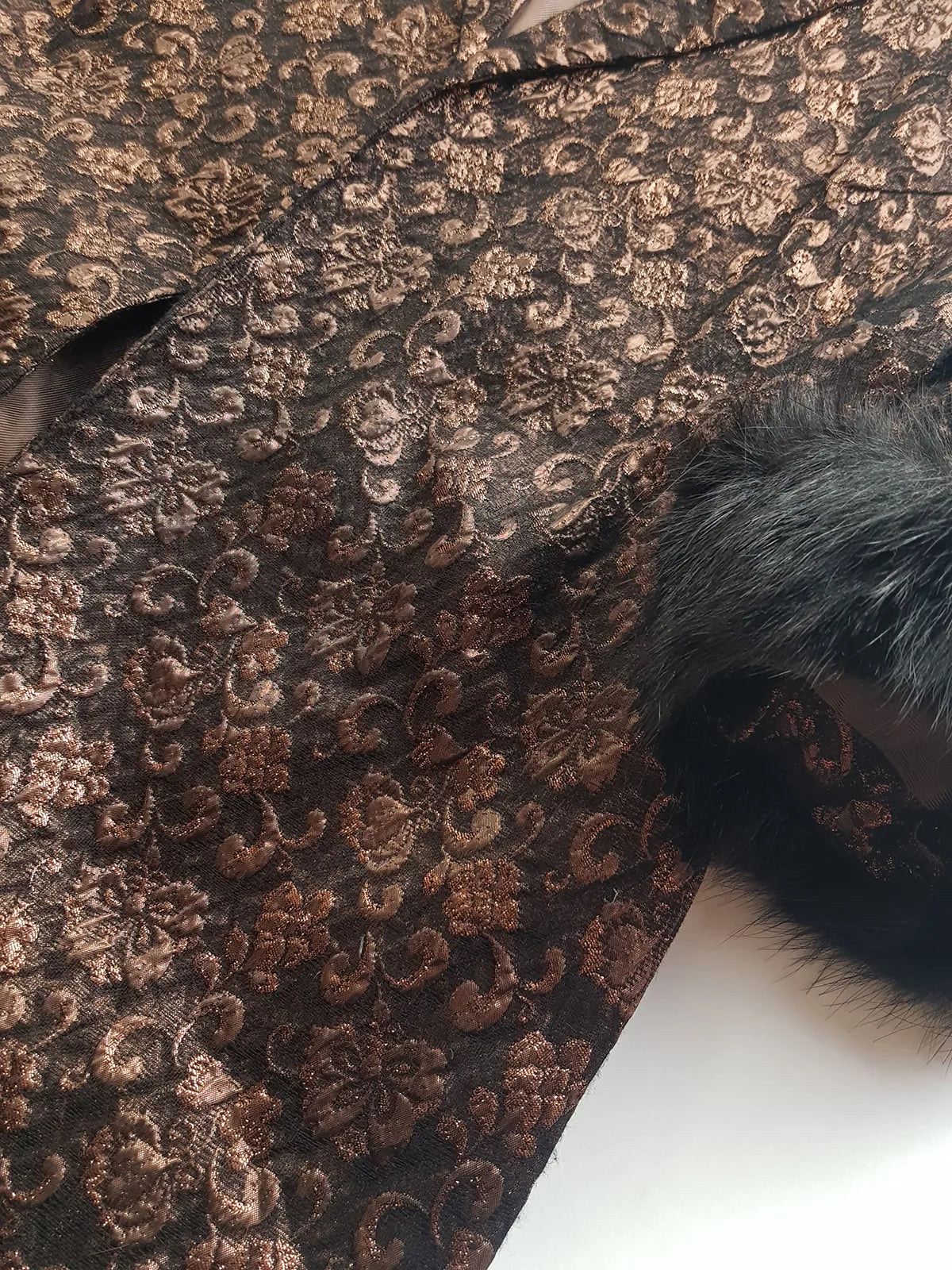1950s Vintage Bronze Evening Coat with Fur Sleeves - Floral Metallic Print - Immaculate Tailoring - Fully Lined