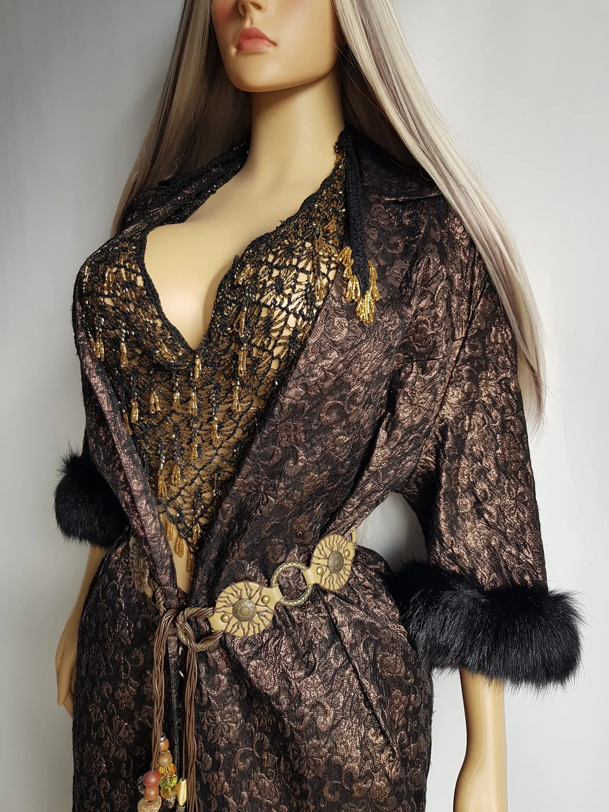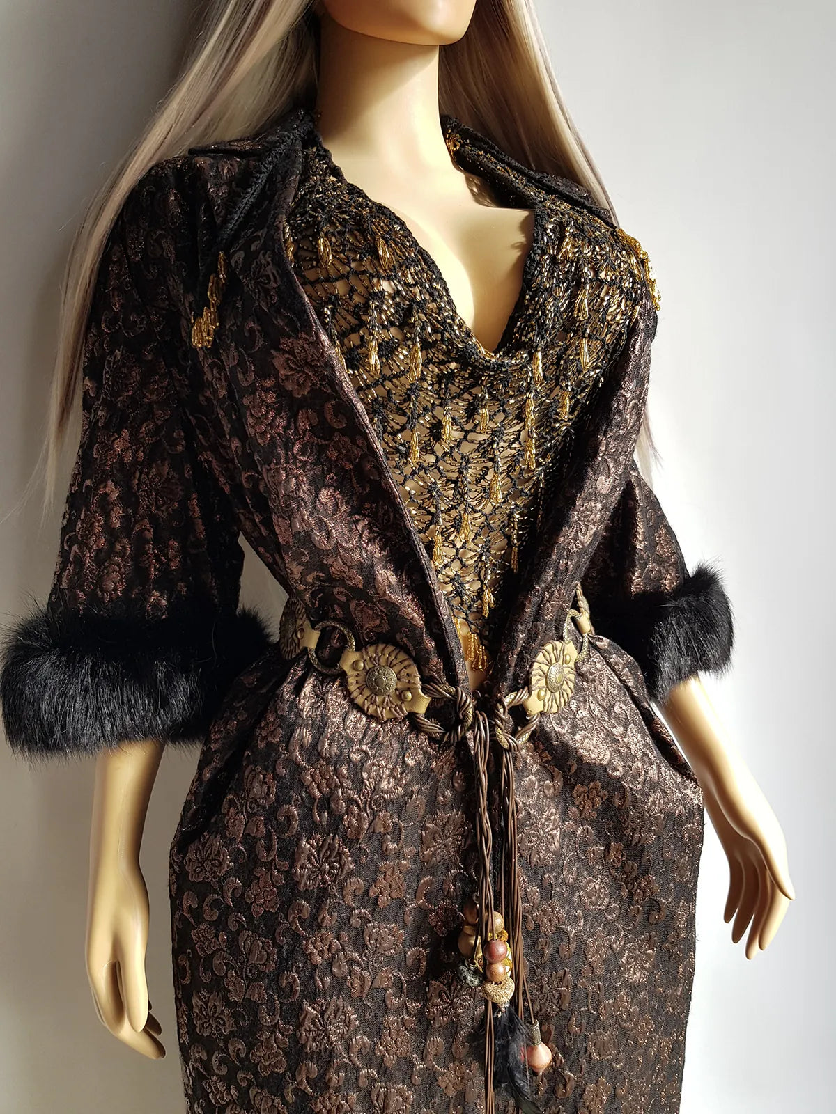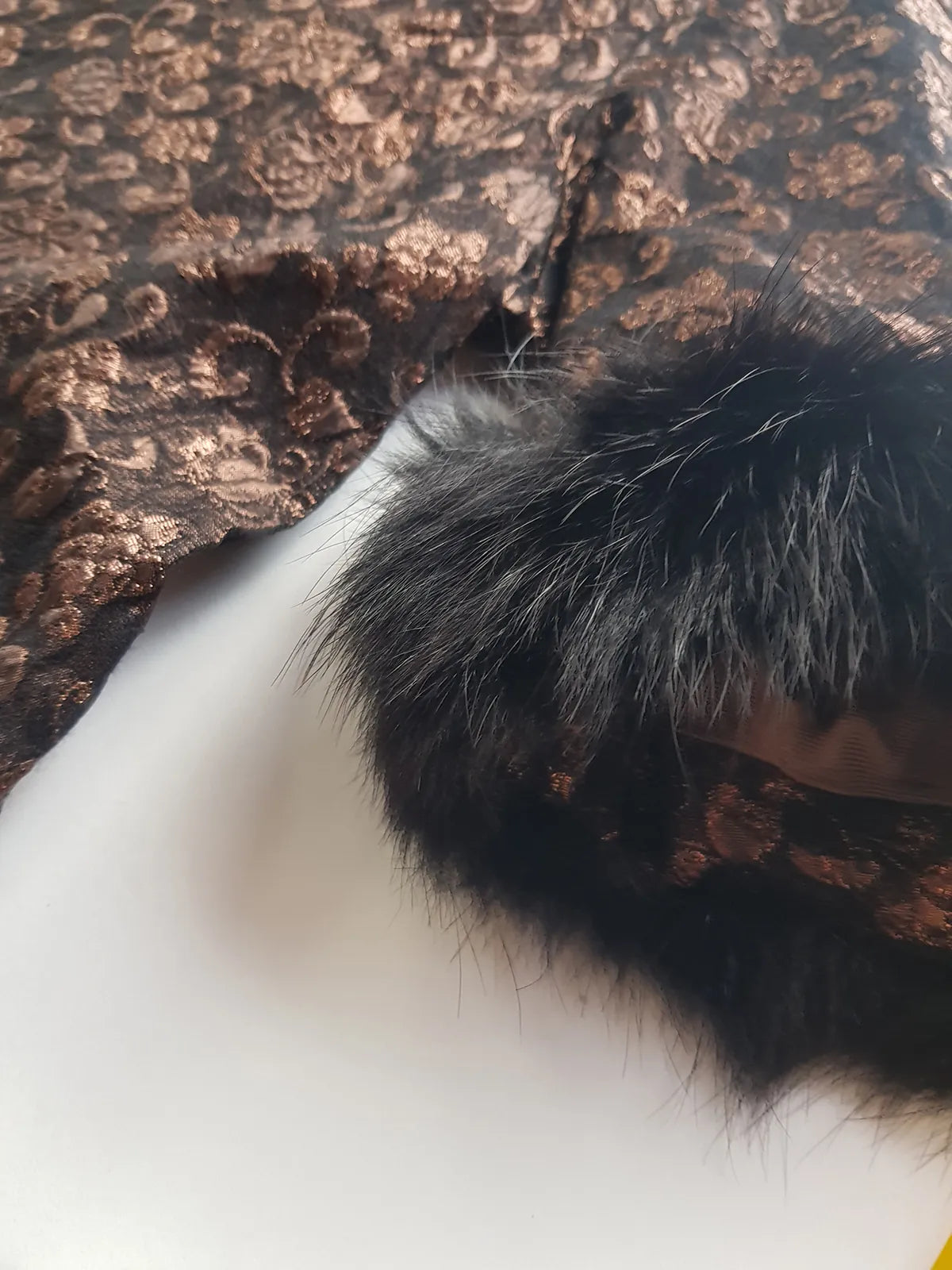 1950s Vintage Bronze Evening Coat with Fur Sleeves - Floral Metallic Print - Immaculate Tailoring - Fully Lined