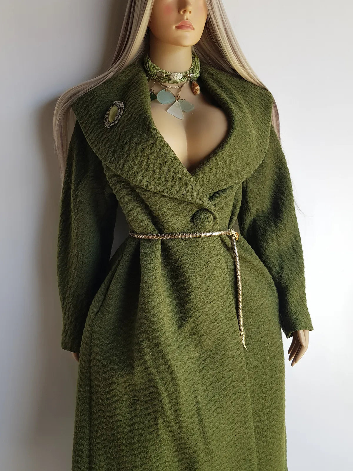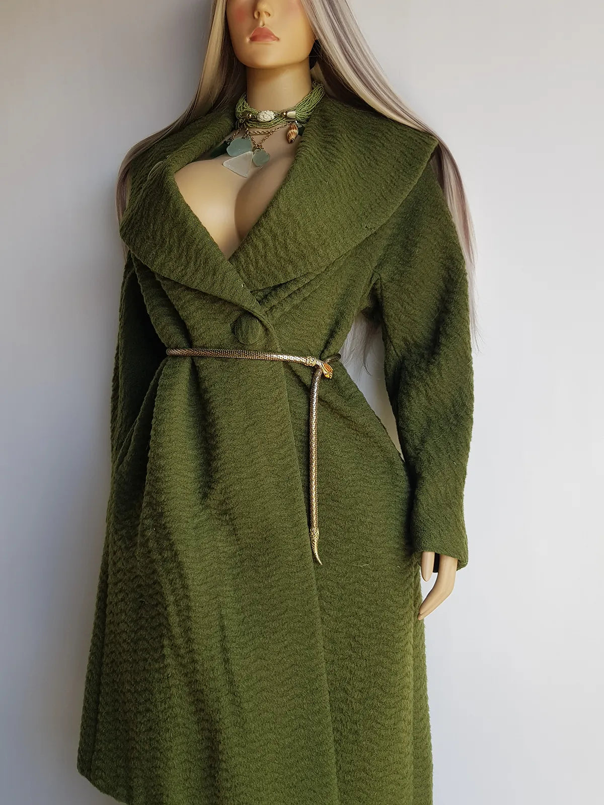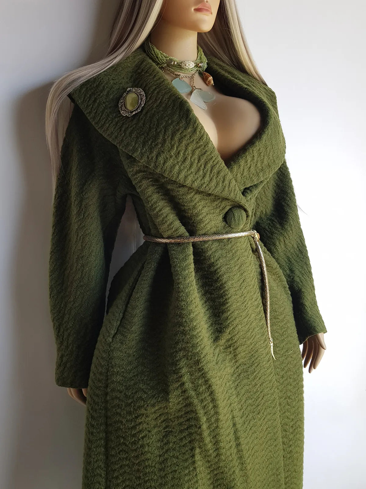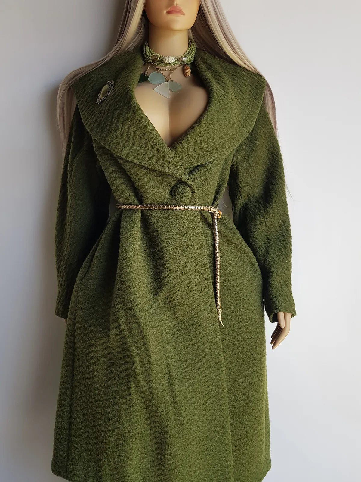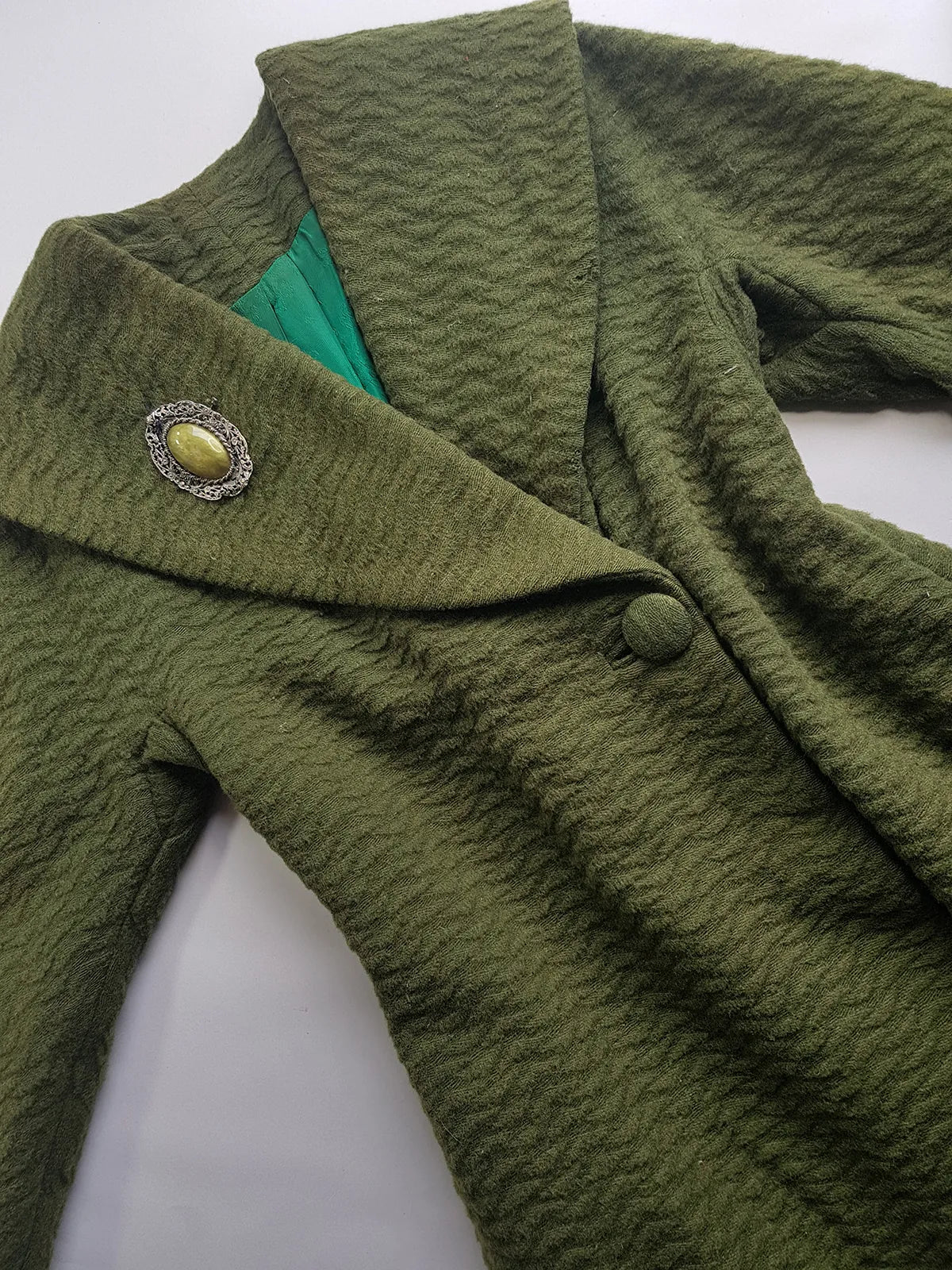 1950s Vintage Wool Hourglass Coat in Incredible Olive Green & Ornate Lapel Brooch - Knee Length - Immaculate Tailoring - Emerald Green Lining