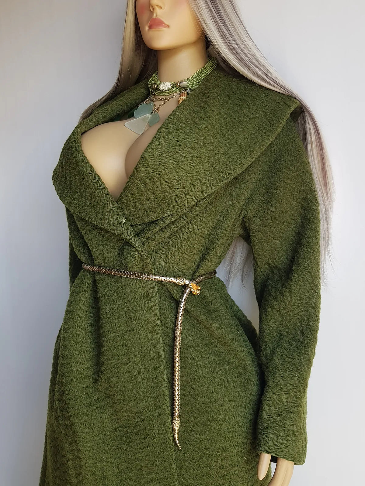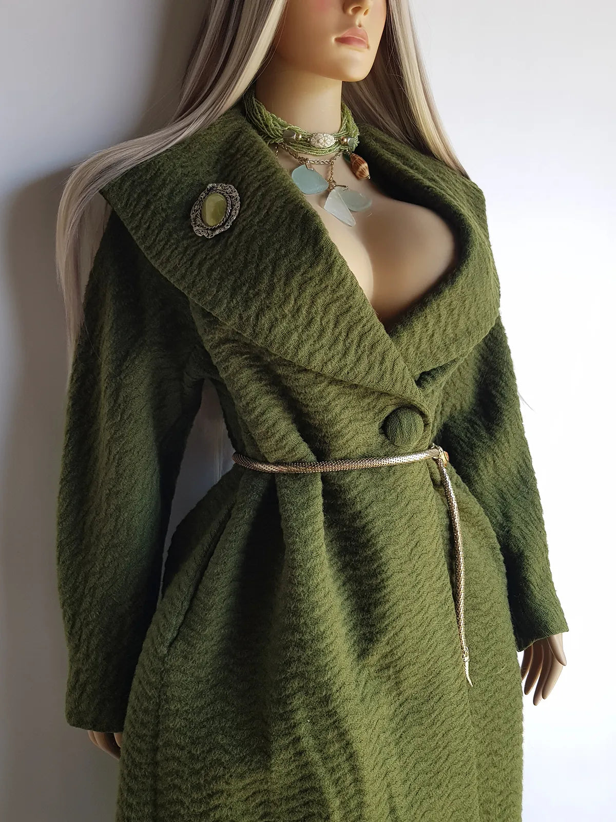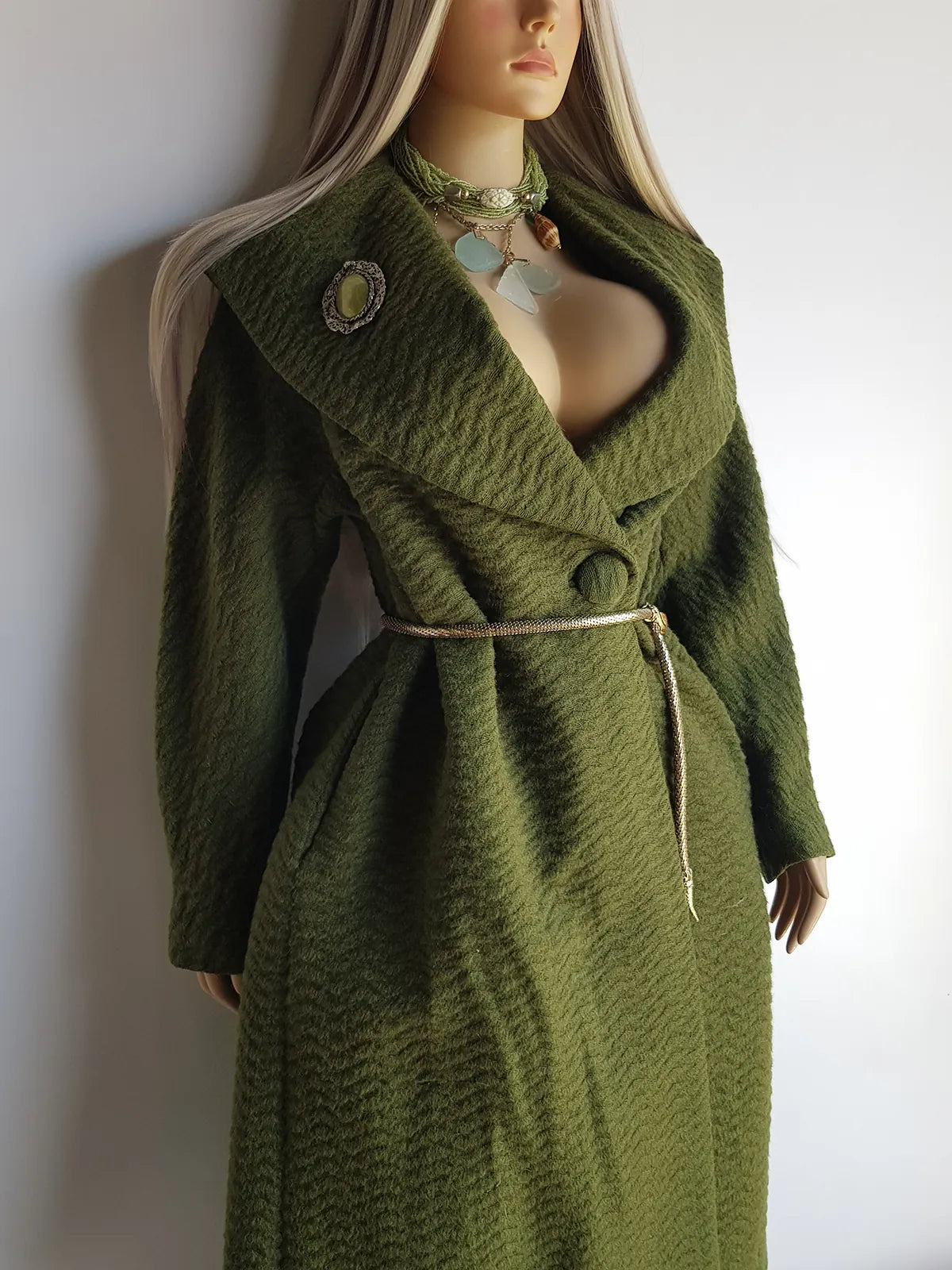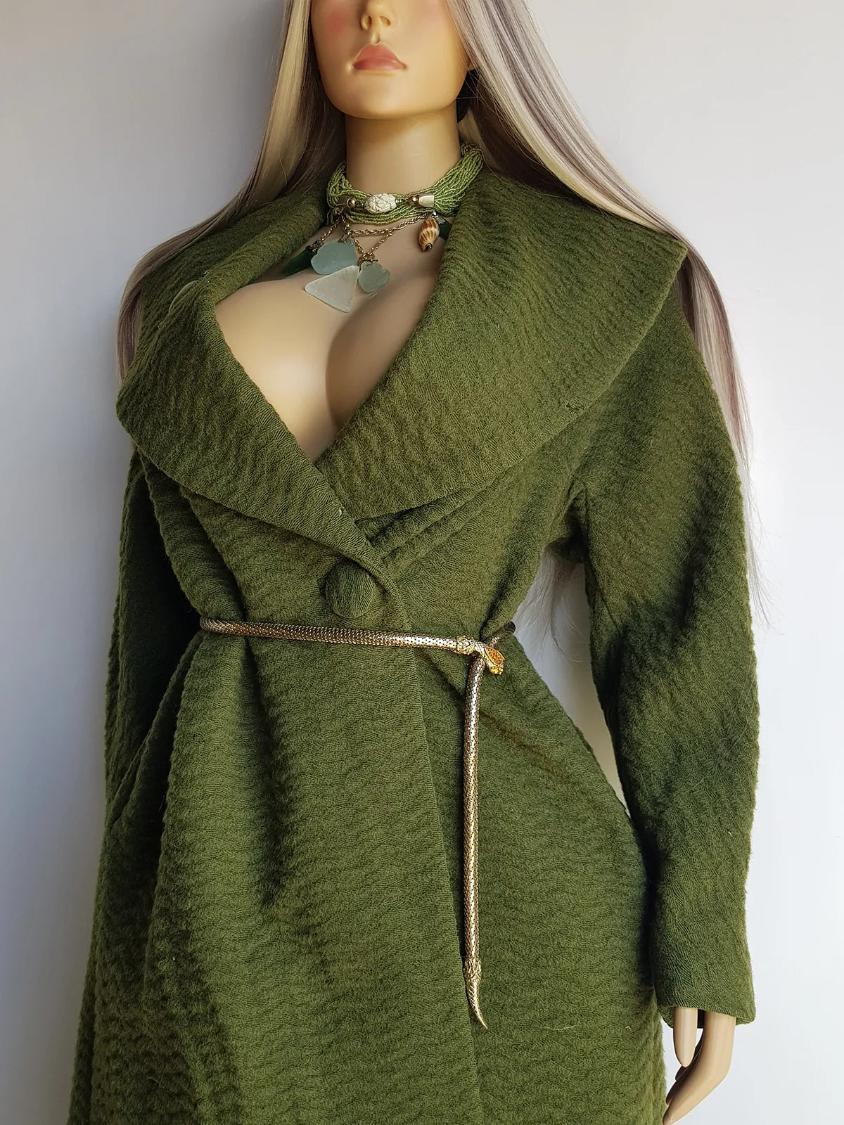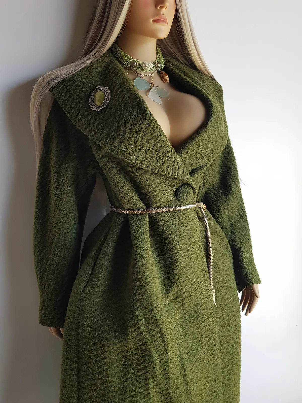 1950s Vintage Wool Hourglass Coat in Incredible Olive Green & Ornate Lapel Brooch - Knee Length - Immaculate Tailoring - Emerald Green Lining