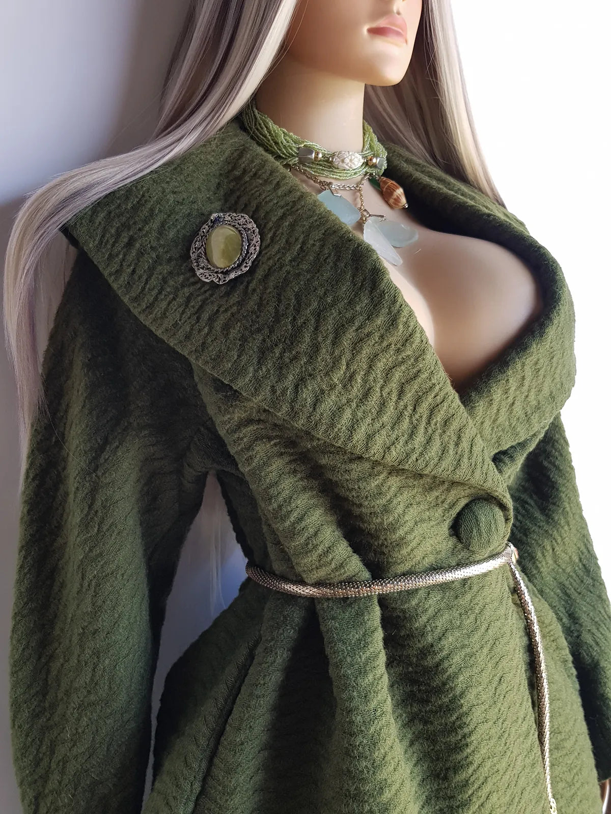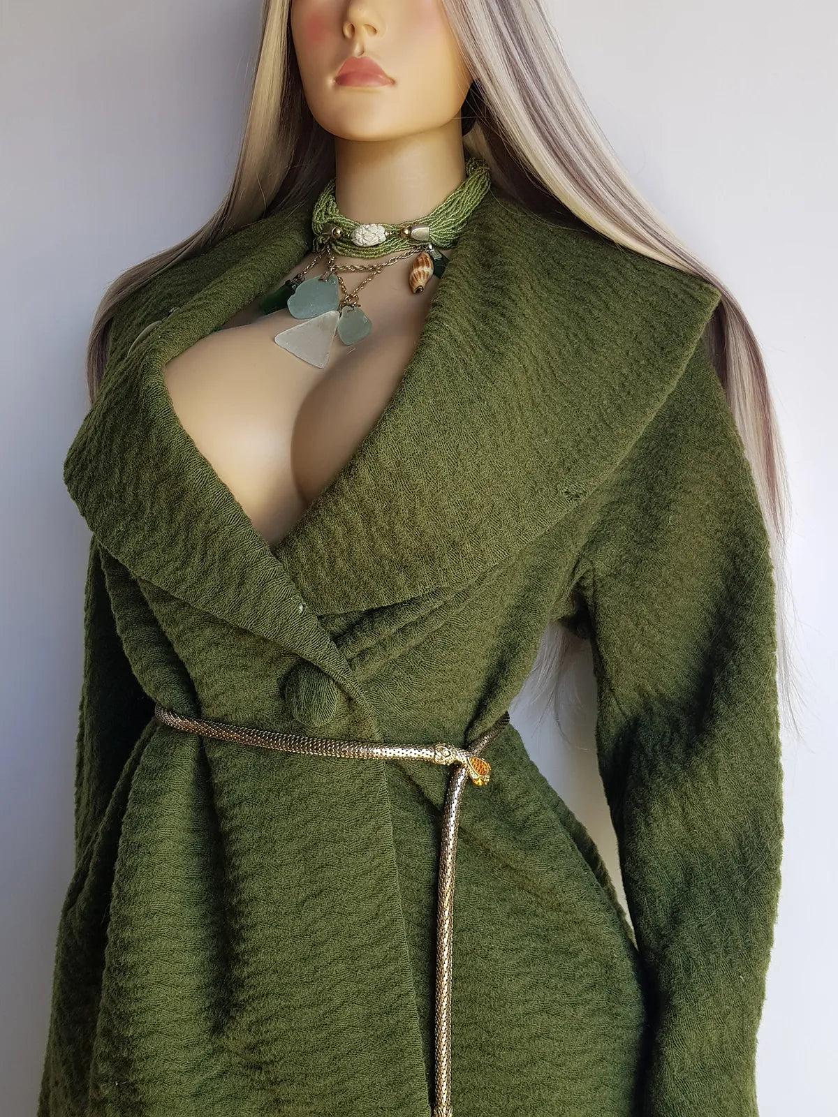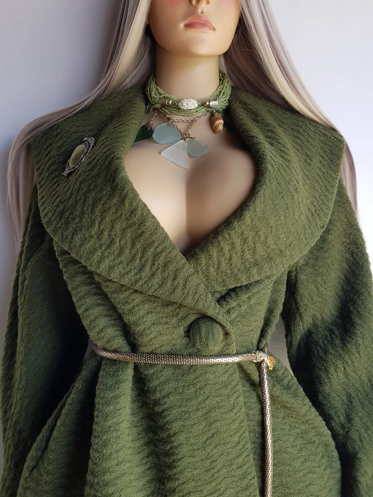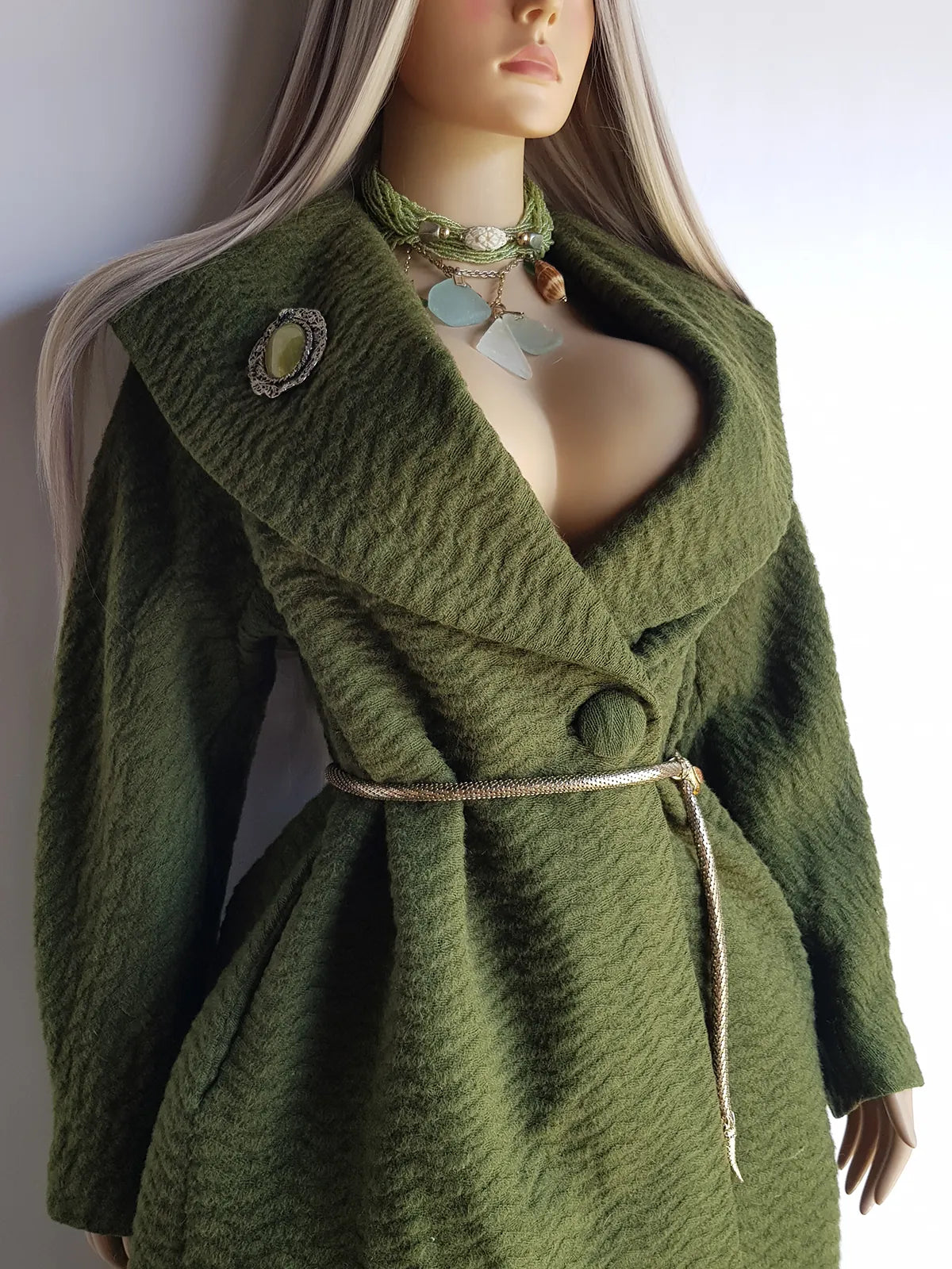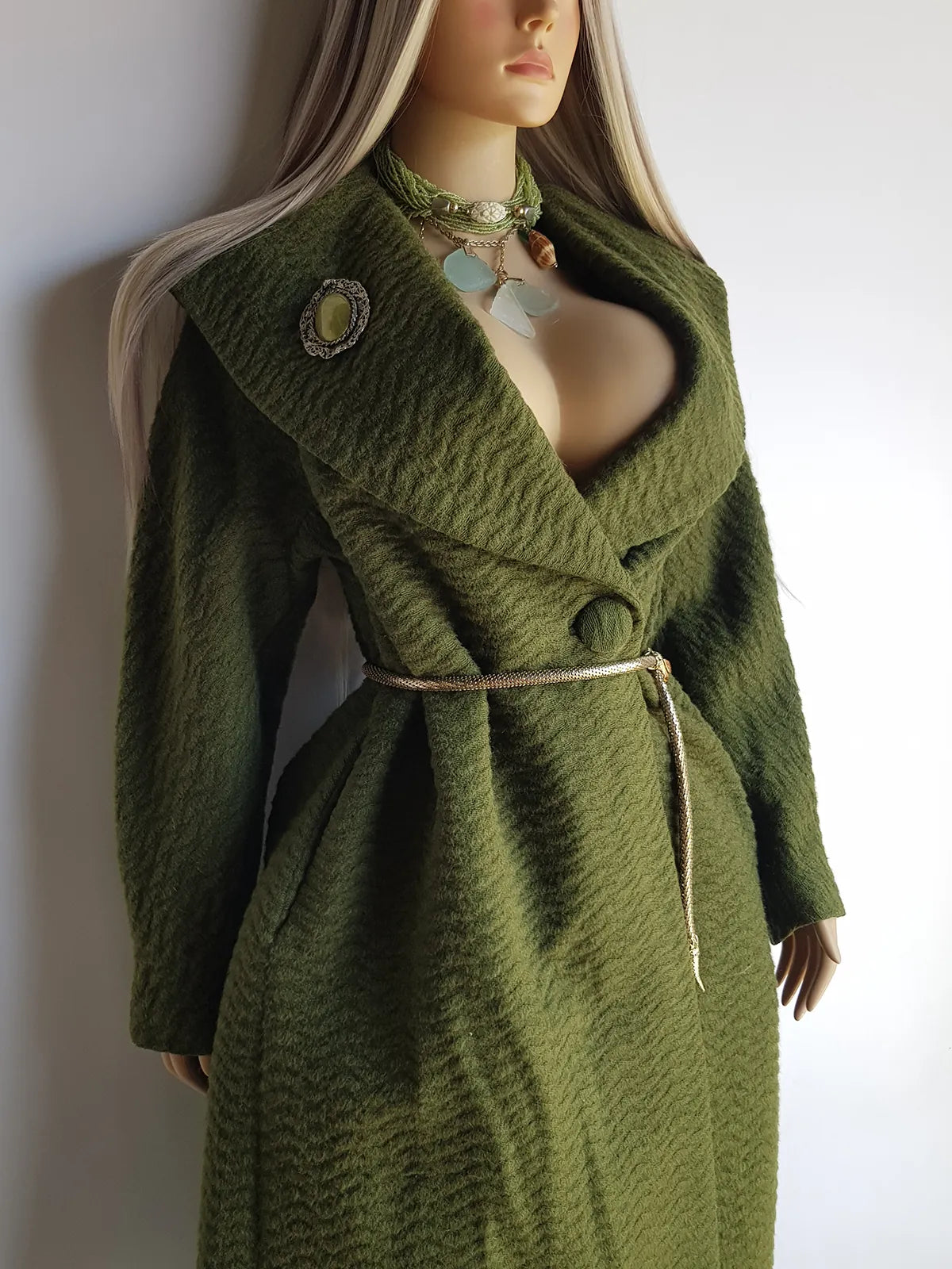 1950s Vintage Wool Hourglass Coat in Incredible Olive Green & Ornate Lapel Brooch - Knee Length - Immaculate Tailoring - Emerald Green Lining