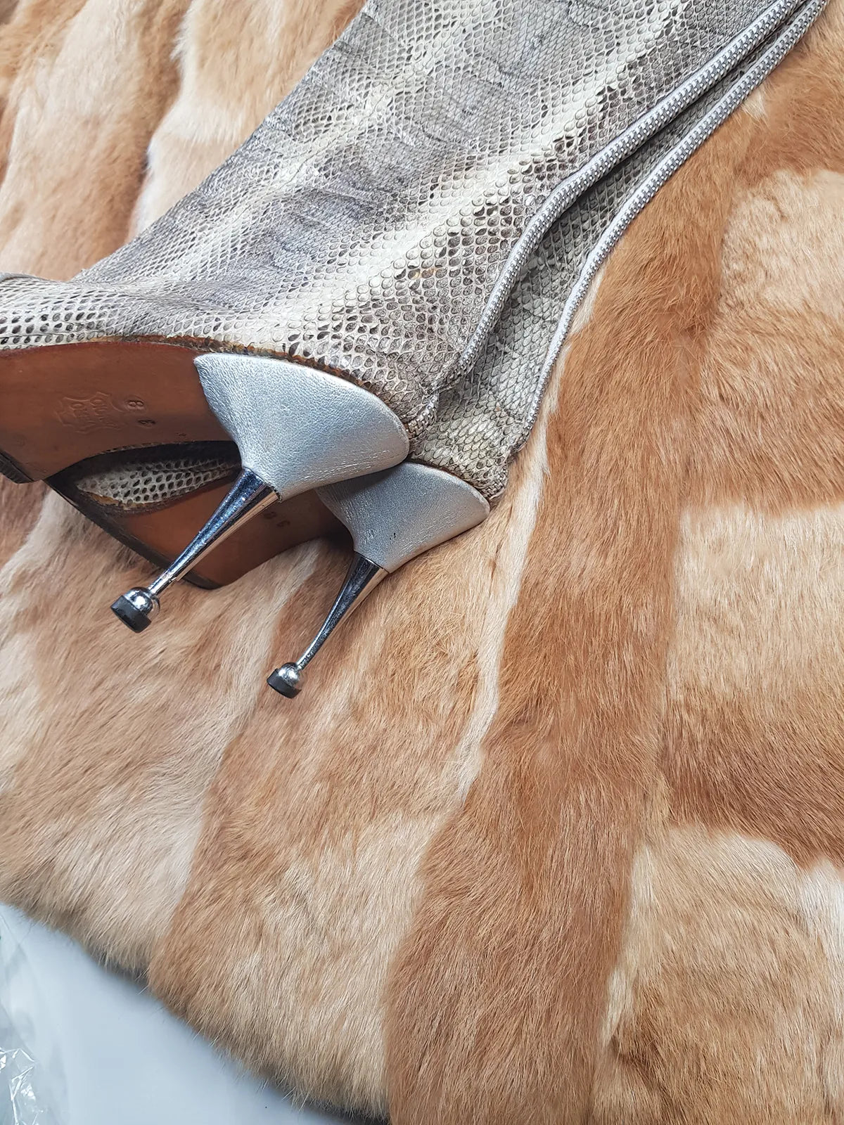 1960s Italian Authentic 100% Snakeskin & Leather Go Go Boots - Insane Metal Stiletto Heels - Silver & Natural Snake (European Size 38)