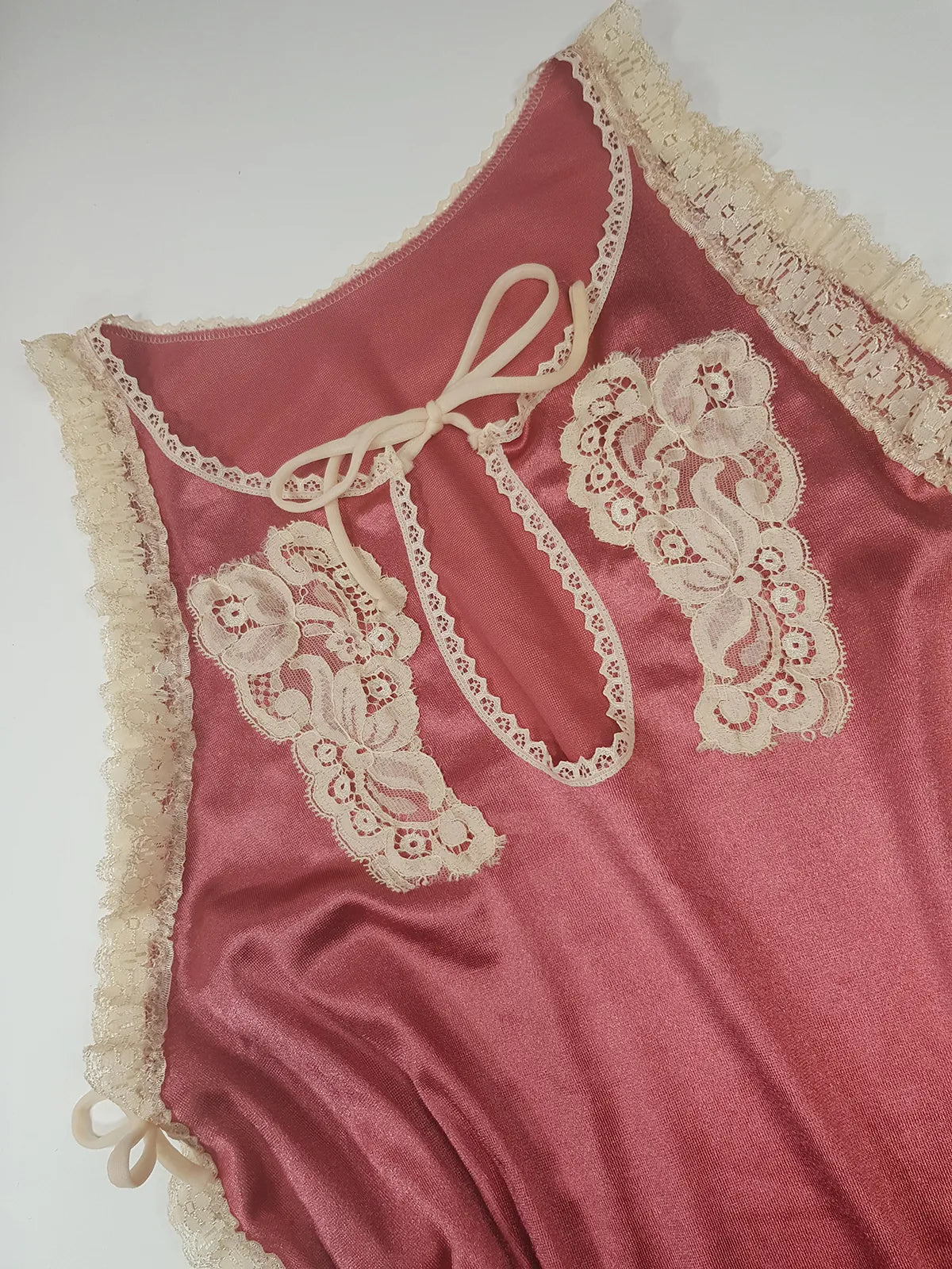 1960s Ultra Rare Intricate - Rose Pink Satin Cream Lace - Babydoll Lingerie Dress with Bows