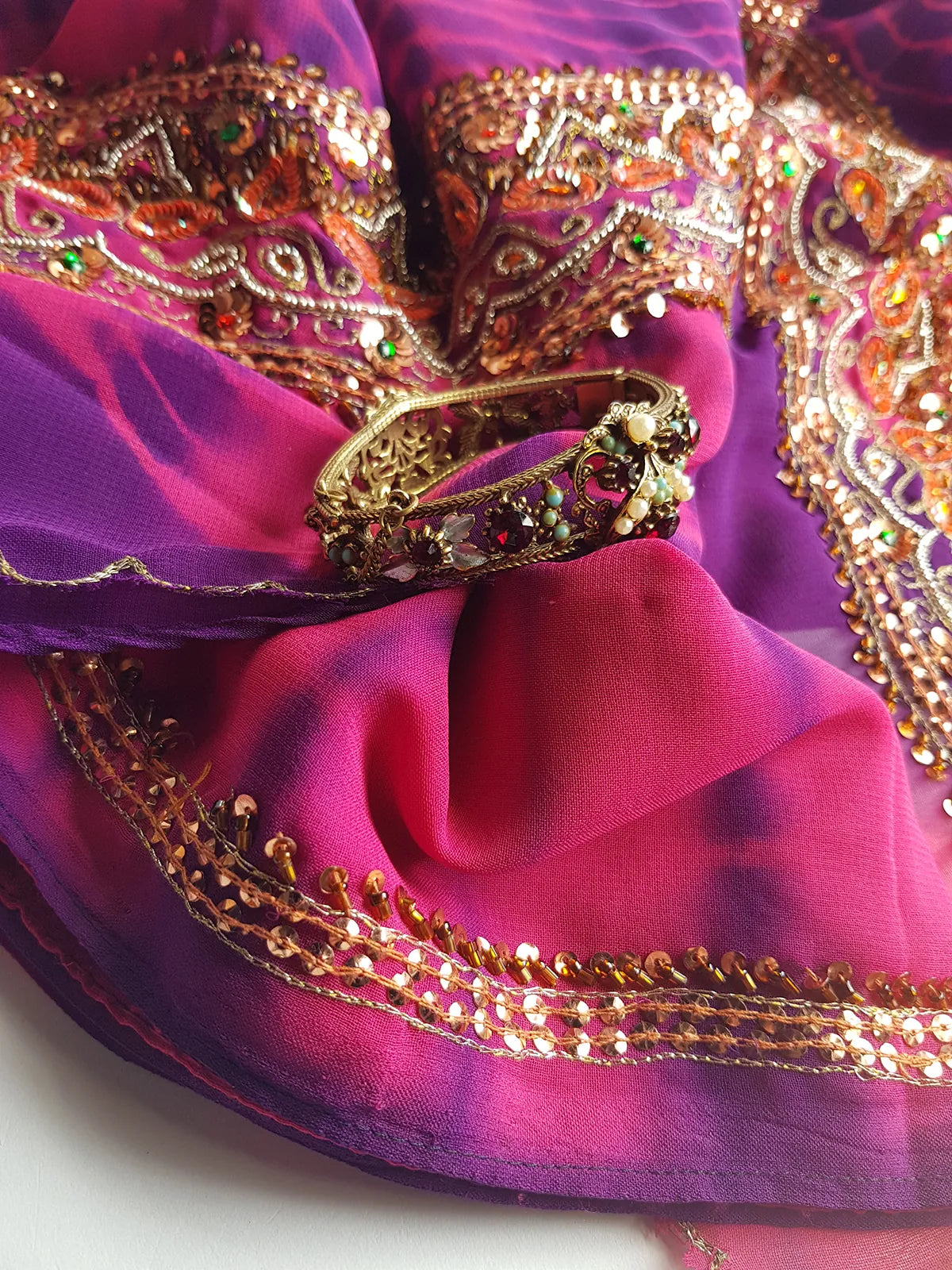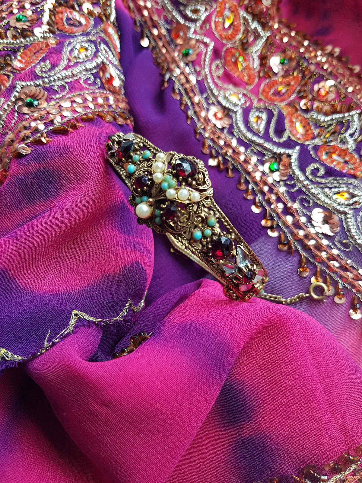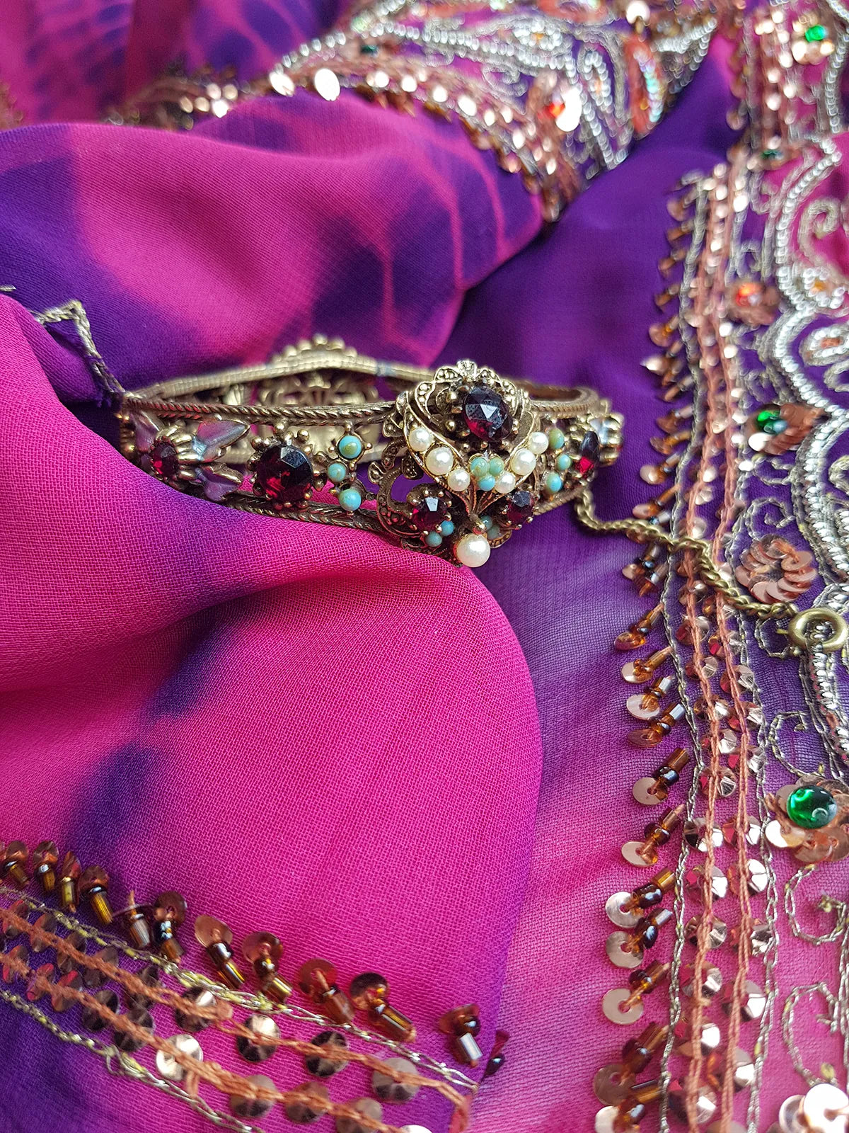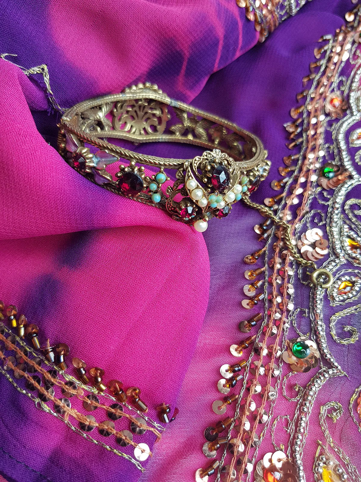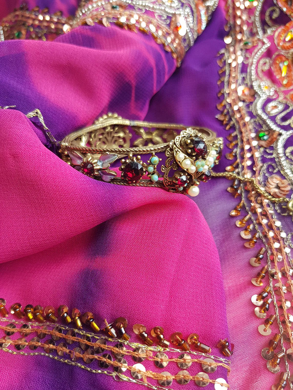 1970s Romantic Gothic Designer Ornate Metal Bracelet - Stones & Pearls - Reversible to be Worn Two Ways - Stamped
