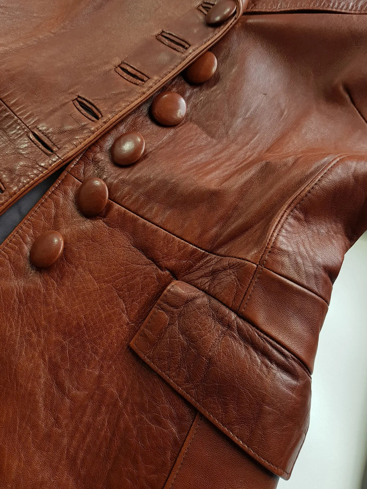 1970s English Made Congac Brown Leather Coat - Beautiful Leather Buttons & Perfect Knee Length