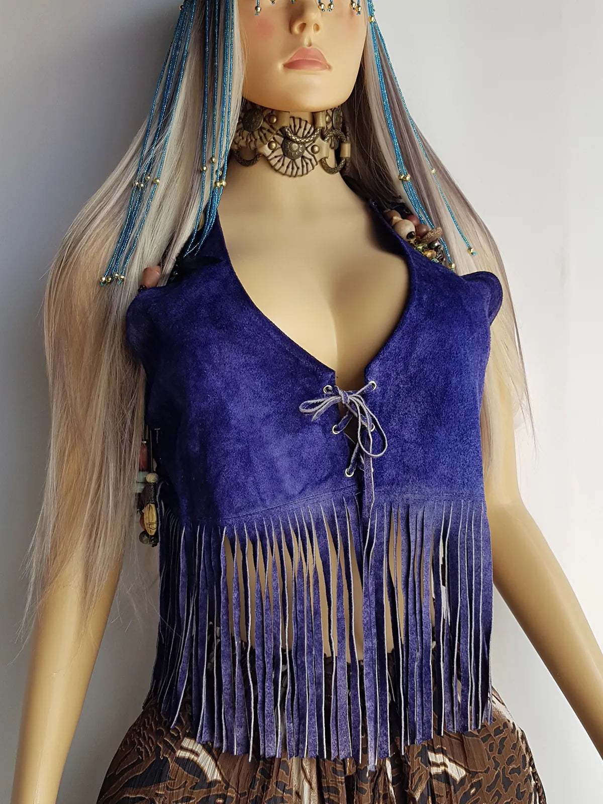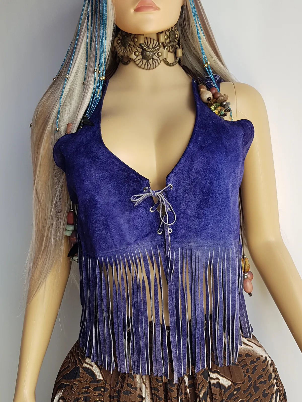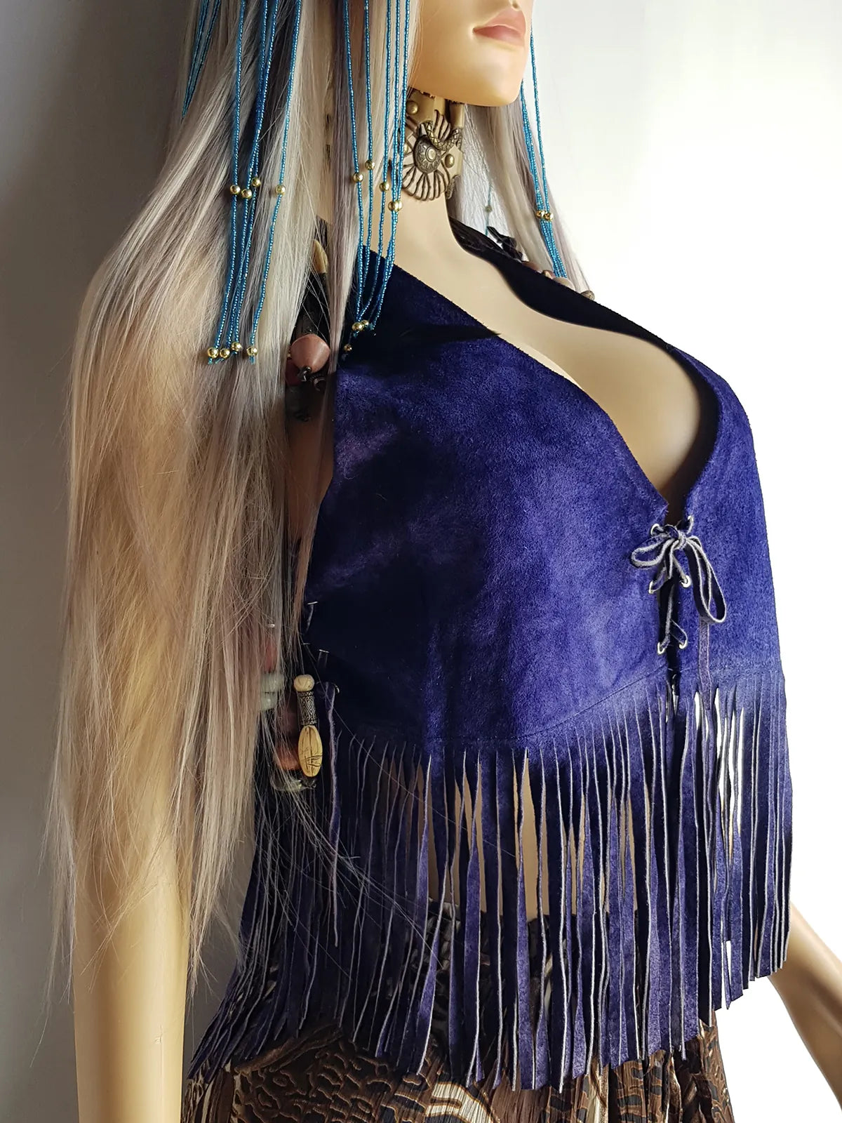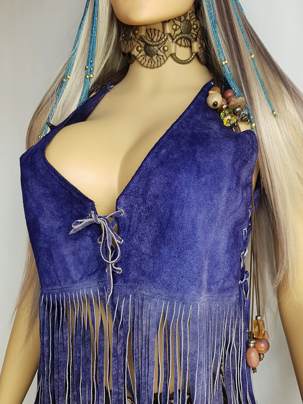 1970s Inky Blue Aged & Faded Soft Suede Tassel Vest -Buttery Soft - Ties at the Front & sides